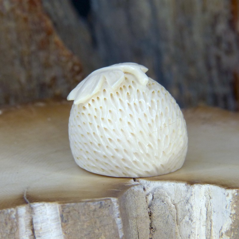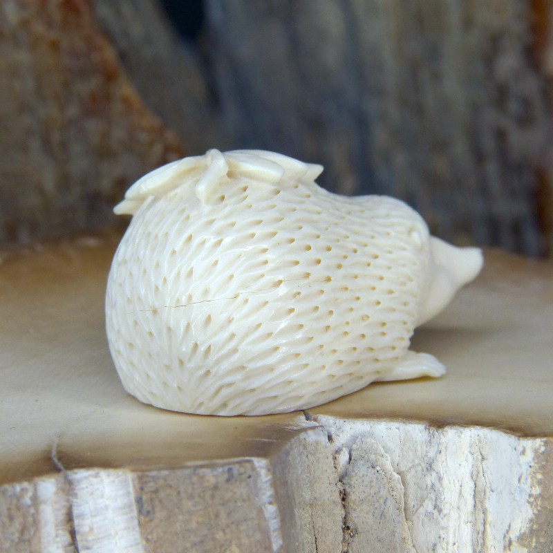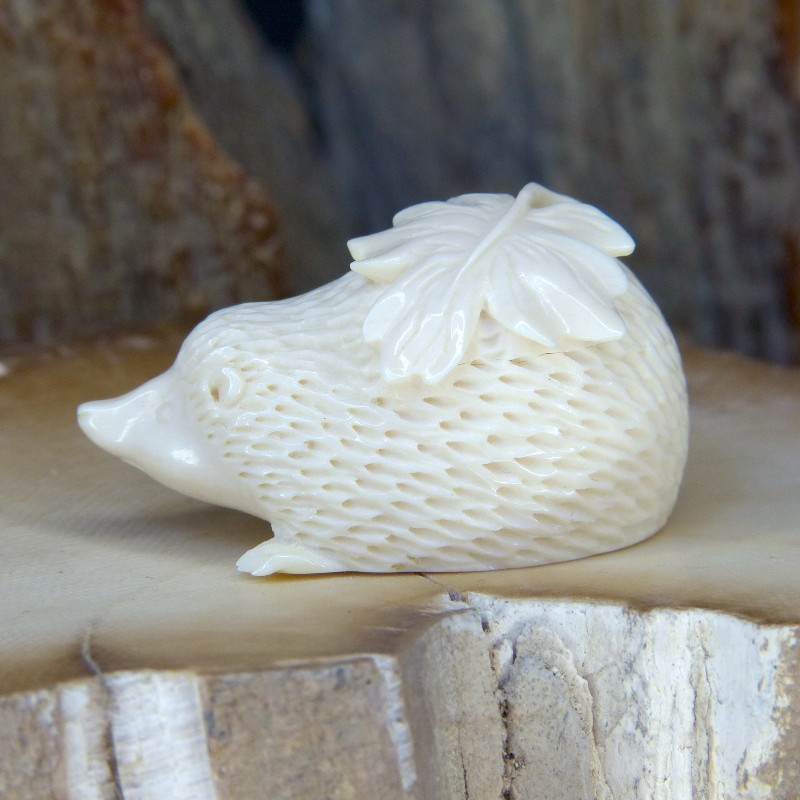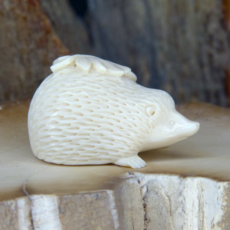 Igel, geschnitzt aus hellem Mammut-Elfenbein mit leichter Maserung. Detaillierte Ausarbeitung mit Ahornblatt auf dem Rücken. Länge ca. 36 mm, Breite ca. 23 mm, Höhe ca. 20 mm.