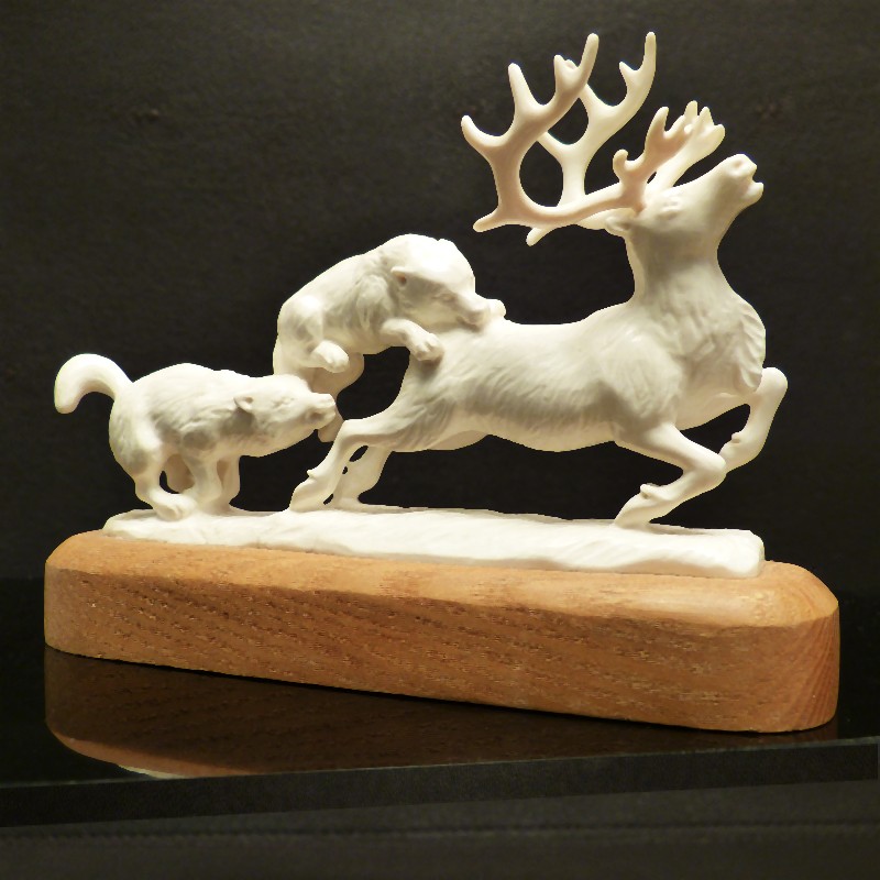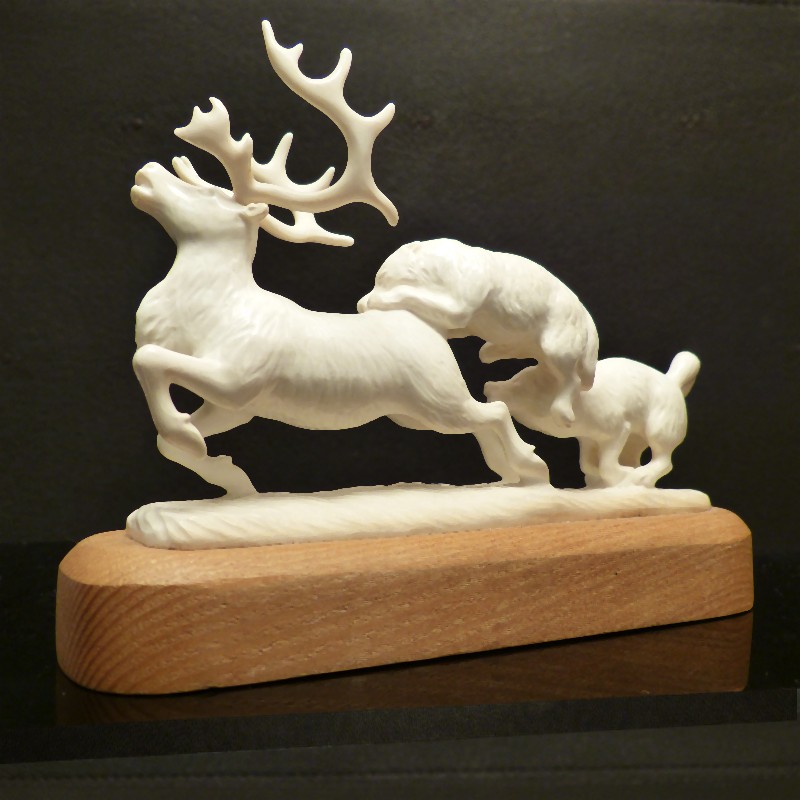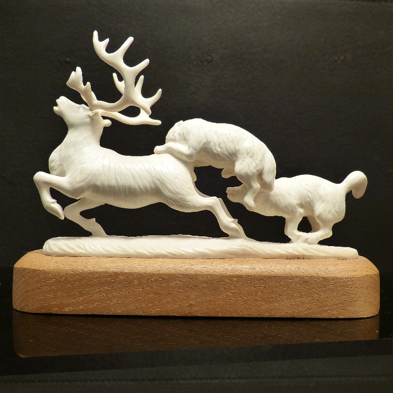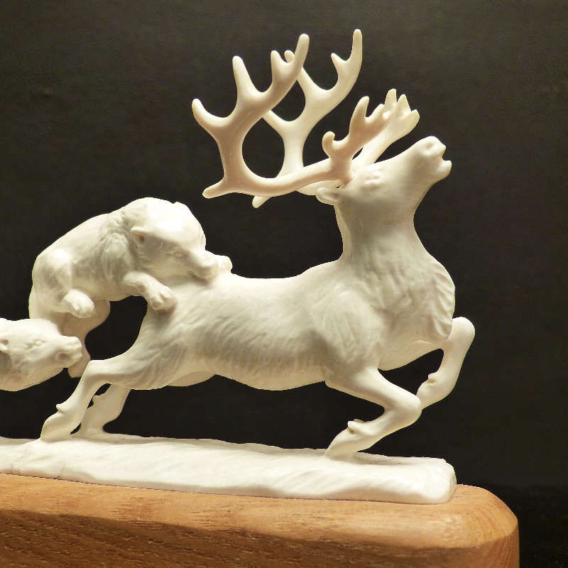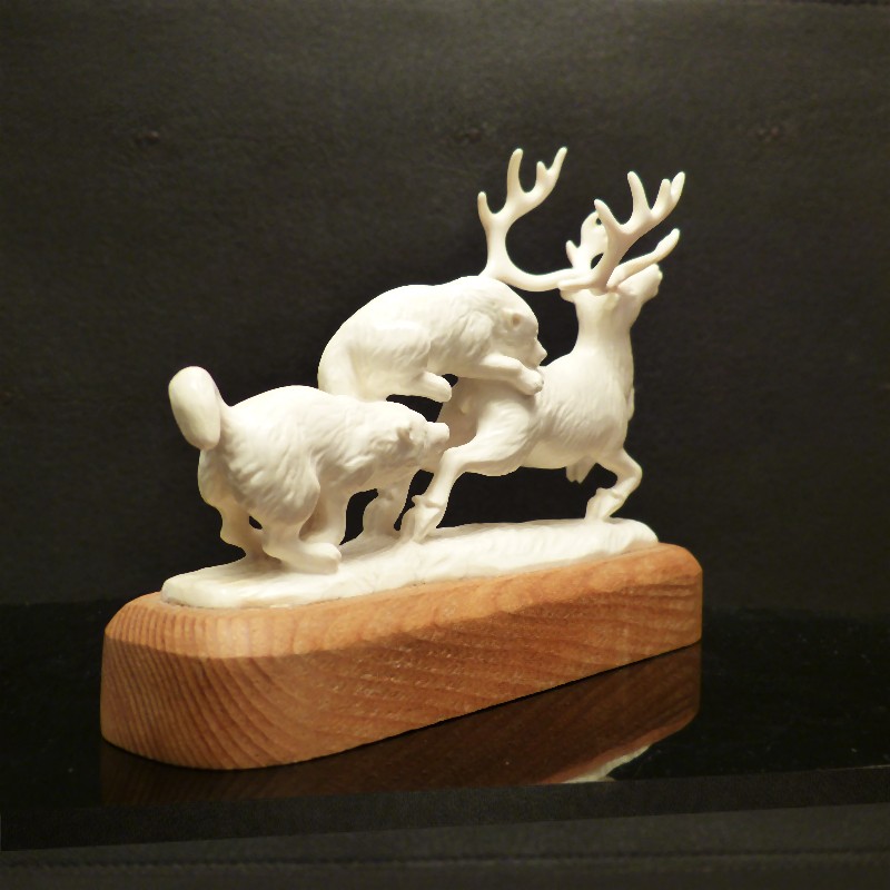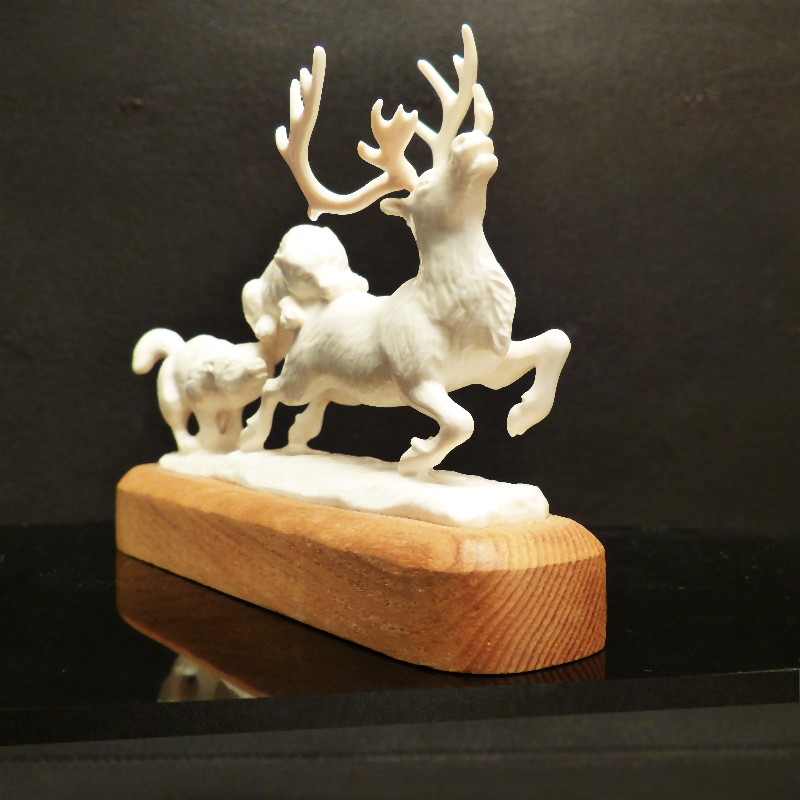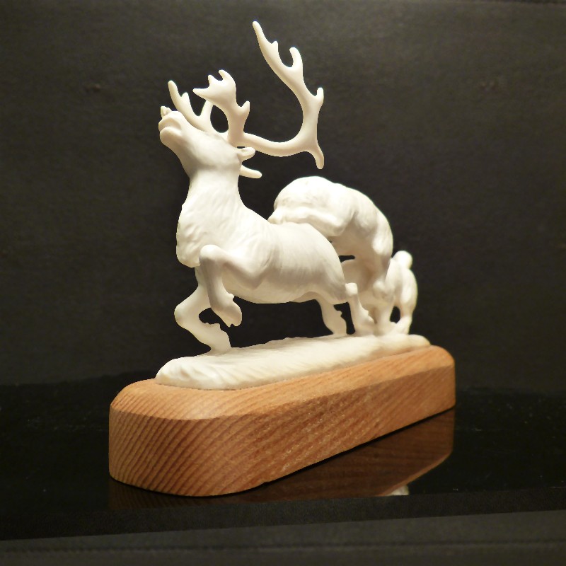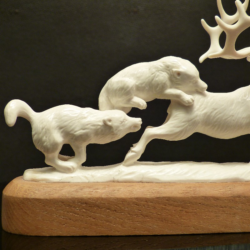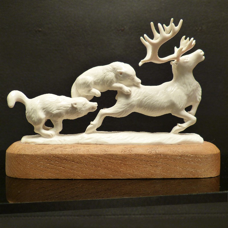 Detailliert ausgearbeitet Figurengruppe aus hellem Mammut-Elfenbein wie man es nur selten findet. Das Rentier samt jagender Wölfe und Sockelplatte wurden mit Ausnahme des Geweihs aus einem Stück gearbeitet. Dieses ist lediglich aufgesteckt und kann für den Transport abgenommen werden. Sehr eindrucksvolle Arbeit in anatomischer Ausführung.