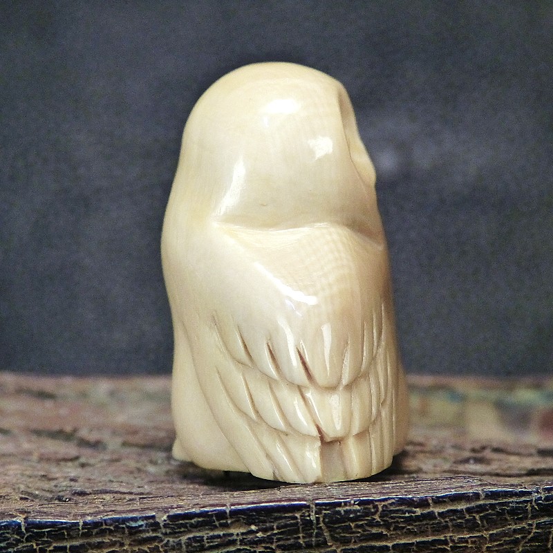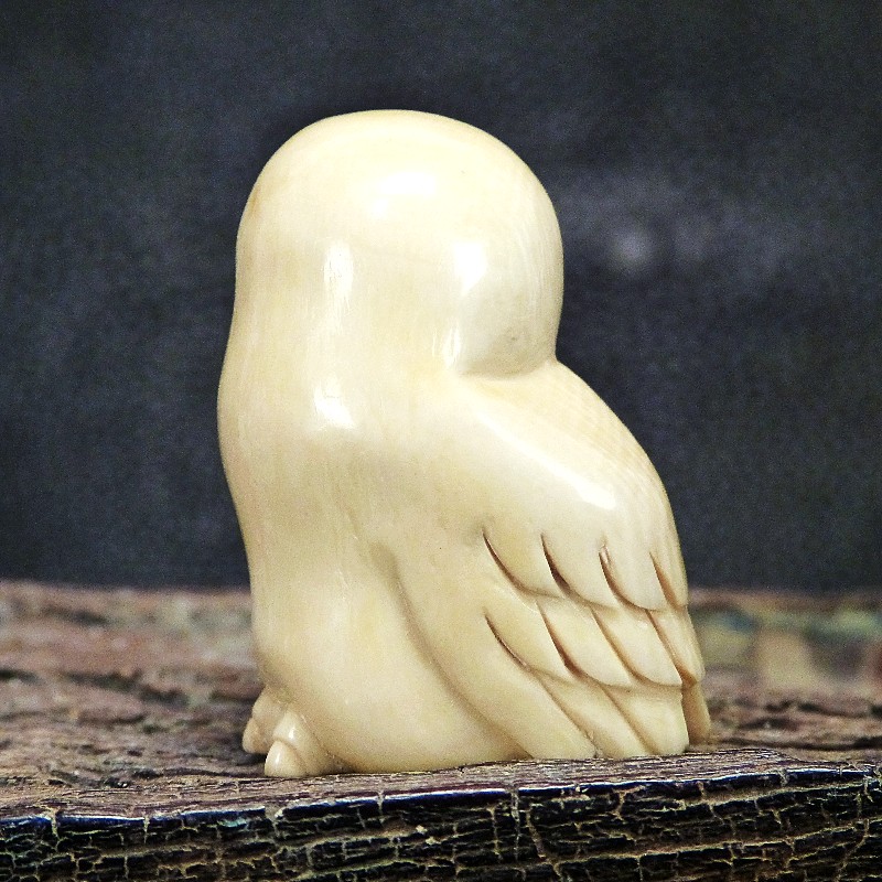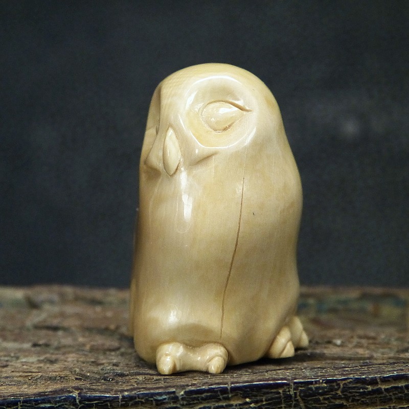 Von Hand geschnitzte Eule aus bräunlichem Mammut-Elfenbein mit ausgeprägter Maserung.