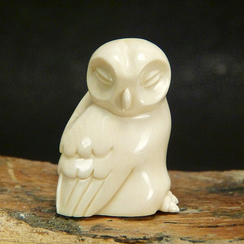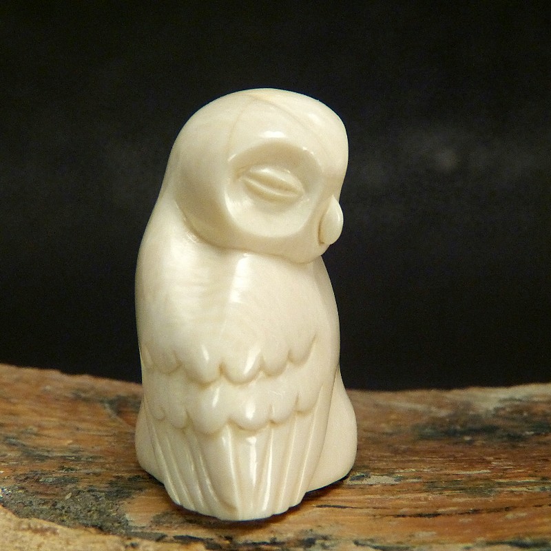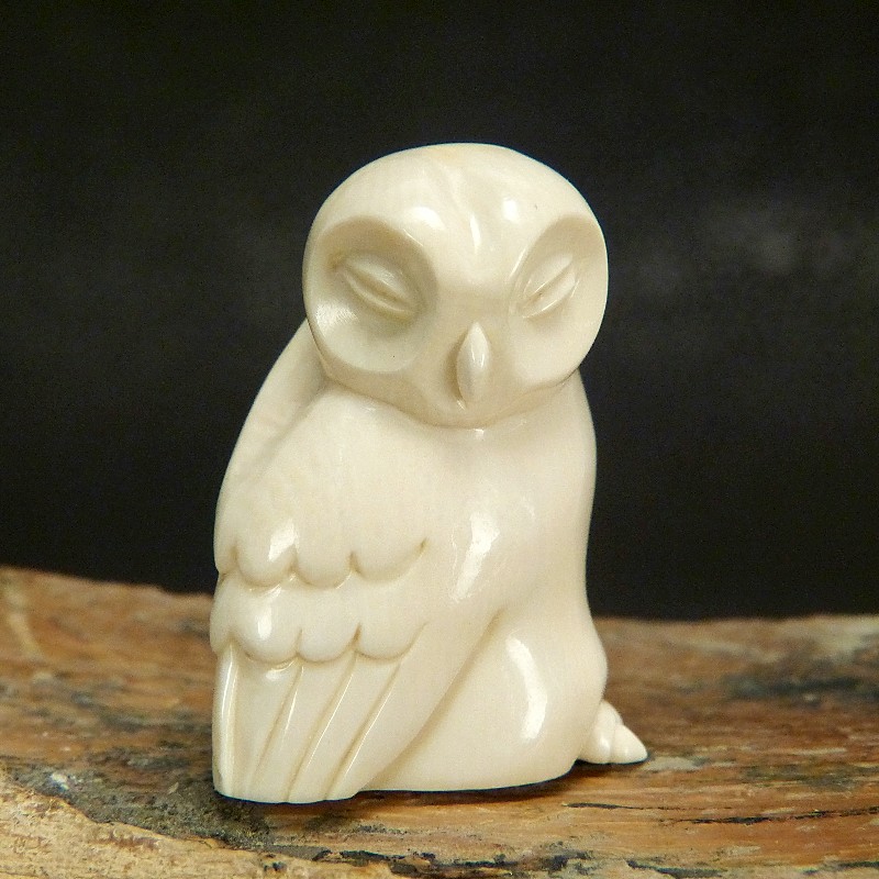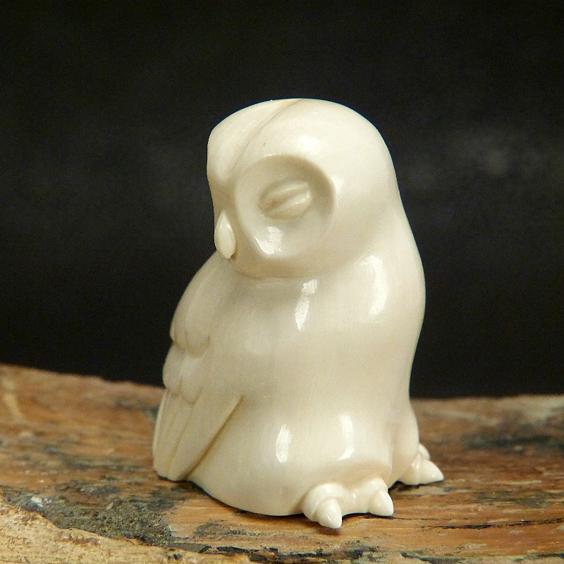Von Hand geschnitzte Eule aus cremefarbenem Mammut-Elfenbein mit leichten Wasserflecken und feiner Maserung. Höhe ca. 40mm x 30 x 23mm.