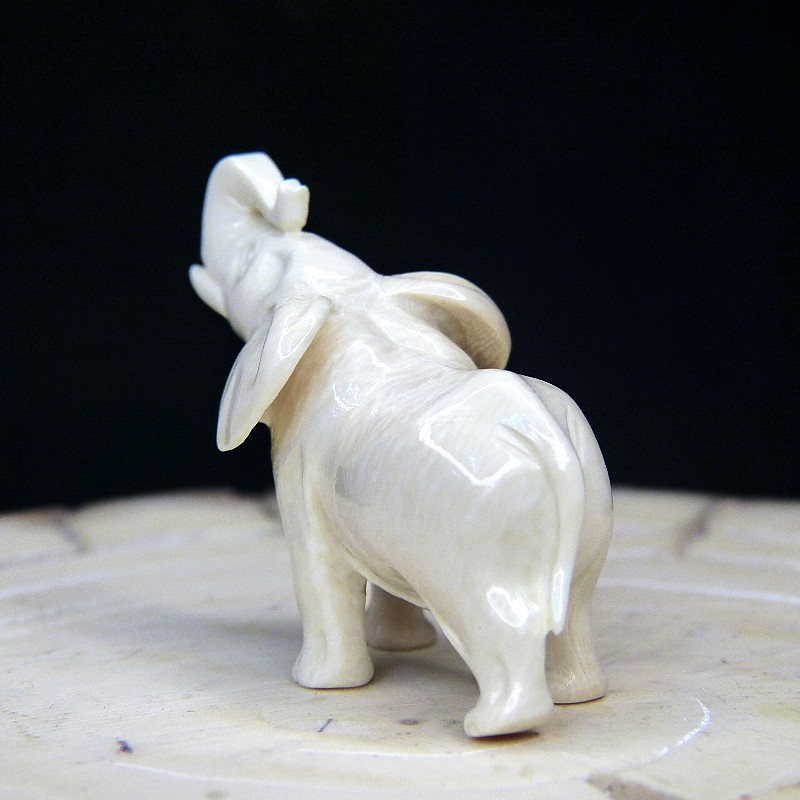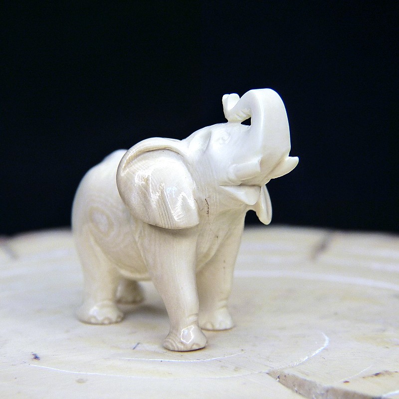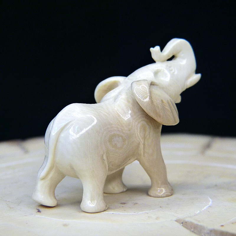 Kleiner Elefant aus hellem Mammut-Elfenbein mit leichten Färbungen. Die Figur hat eine Rüsselhöhe von ca. 34mm und eine Länge von ca. 45mm.