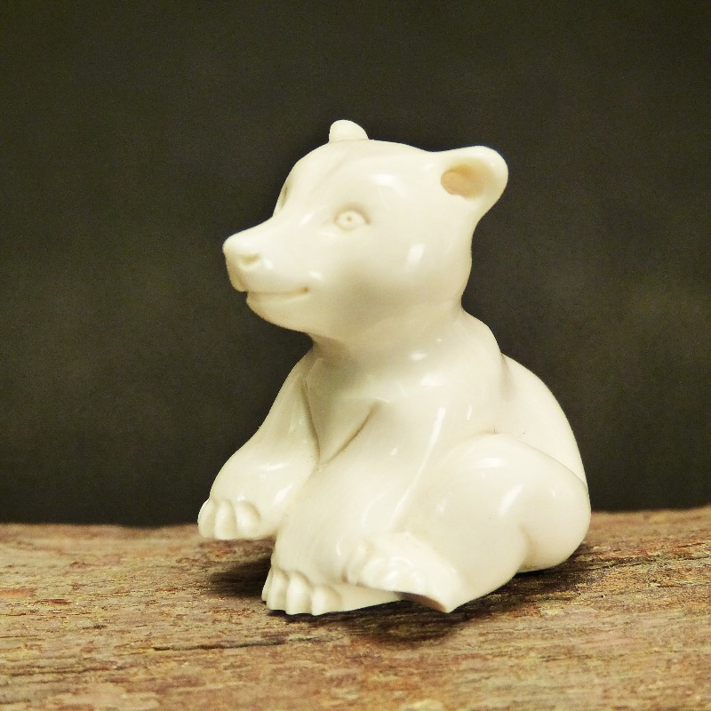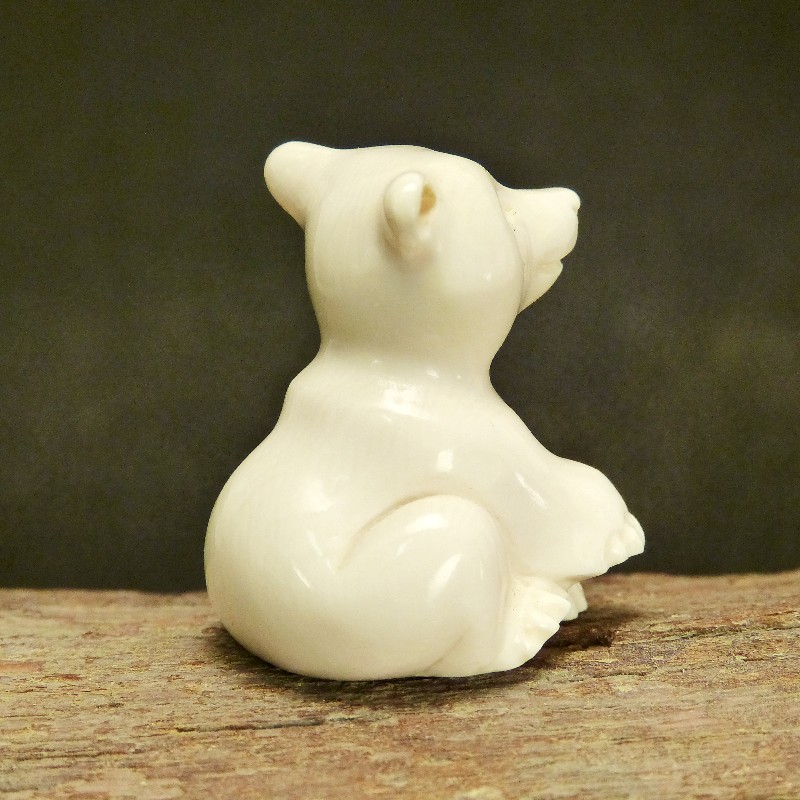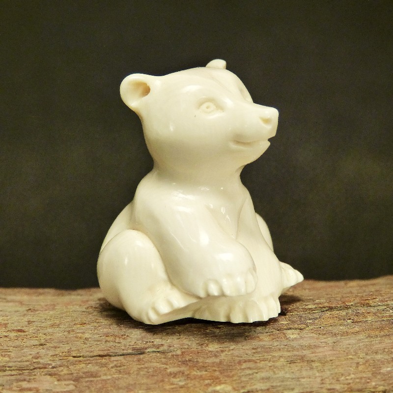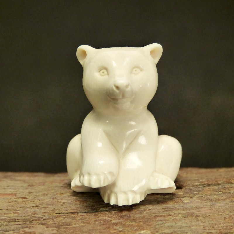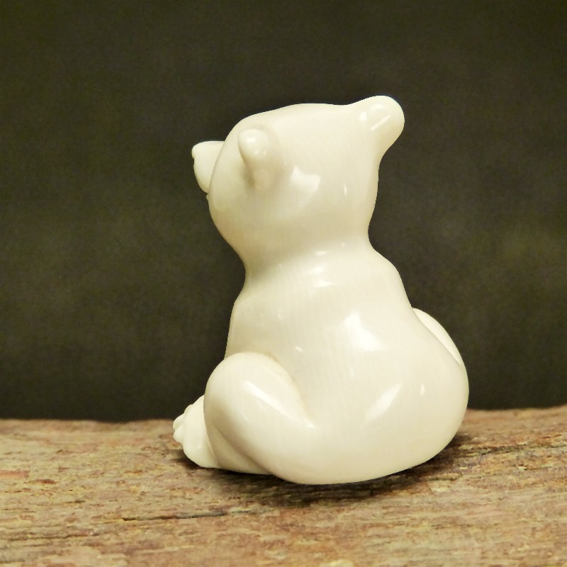 Kleiner sitzender Bär, geschnitzt aus hellem Mammutelfenbein mit feiner Maserung. Er hat eine Größe von ca. 33mm bei einer Breite und Tiefe von ca. 27 x 29 mm.