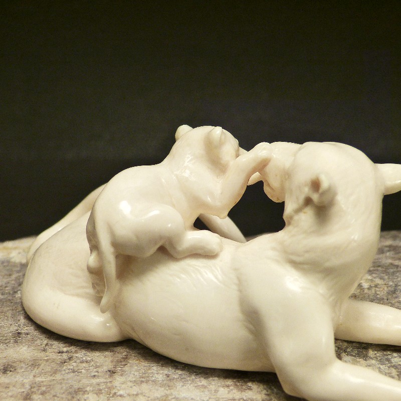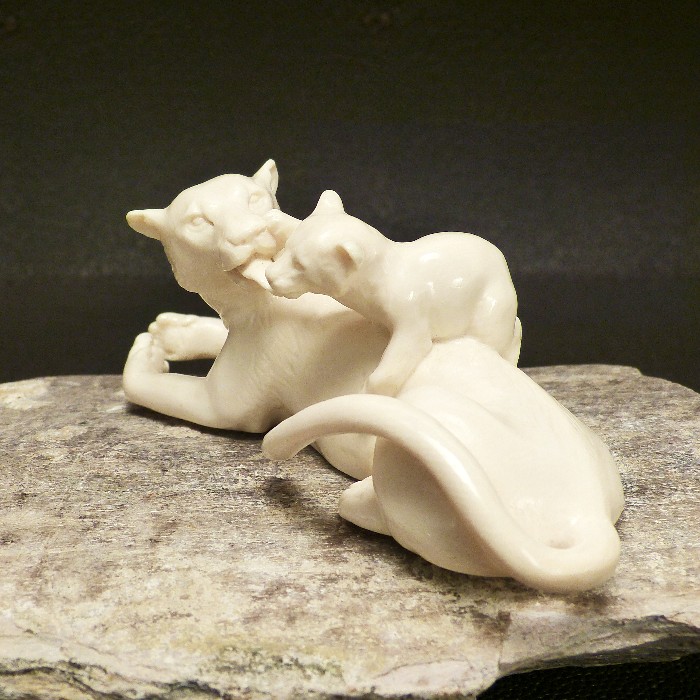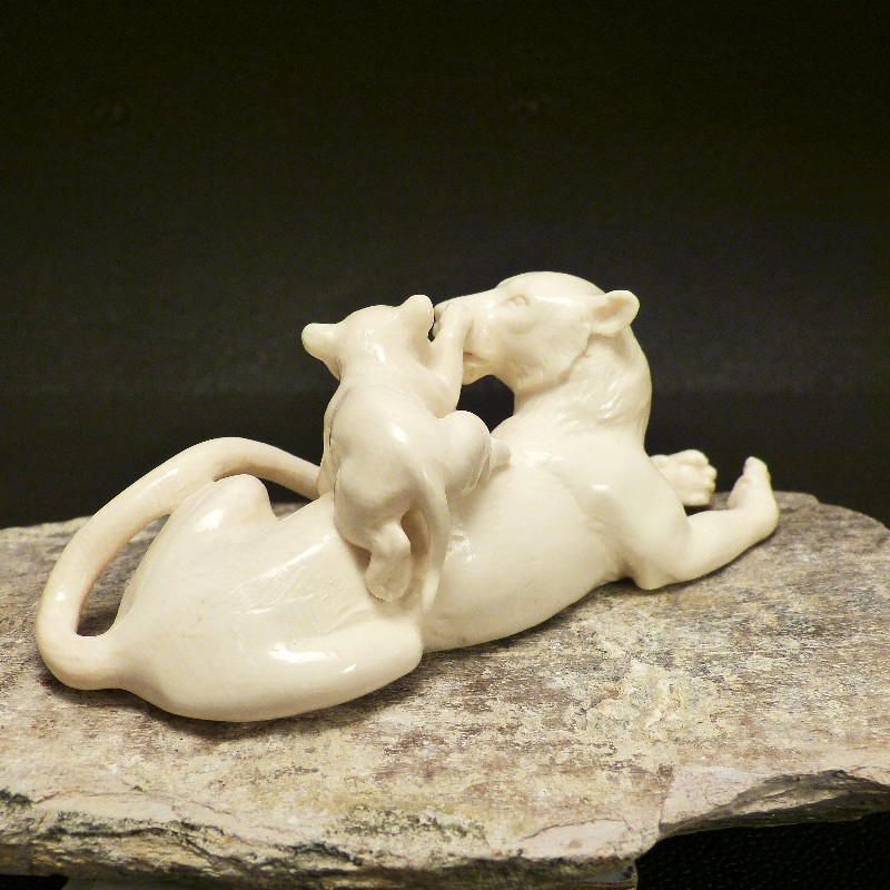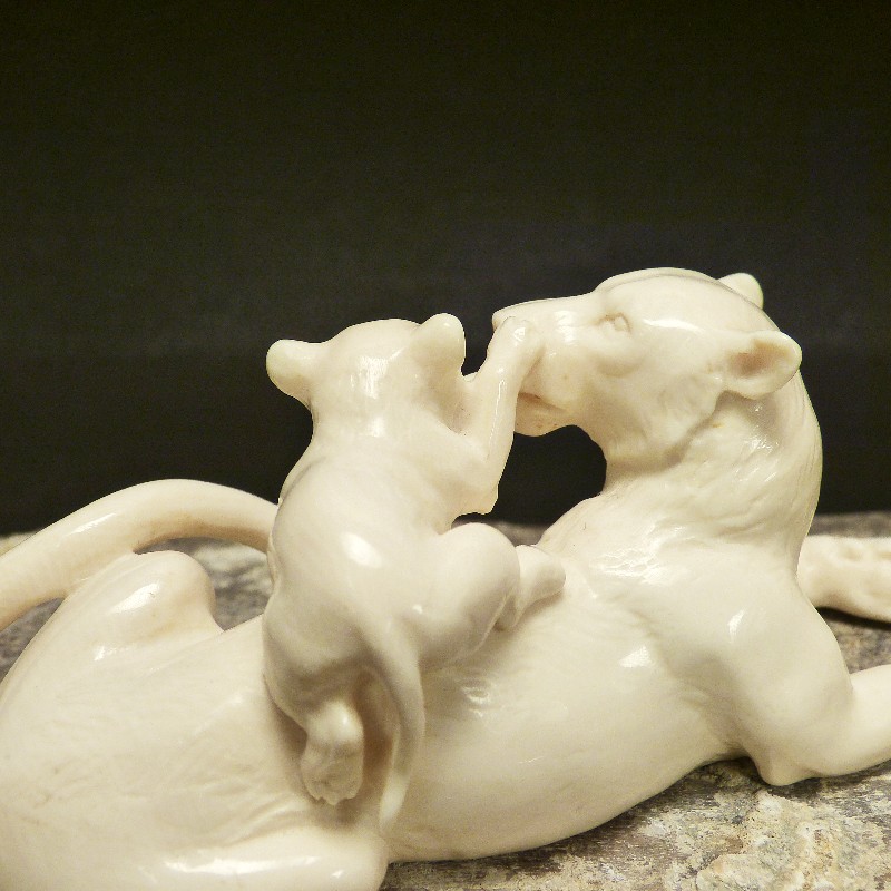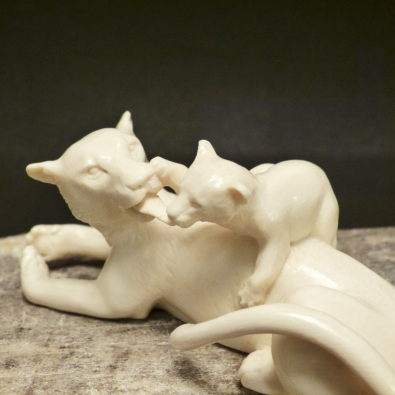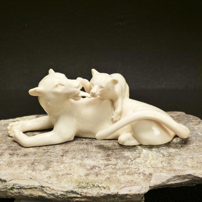 Tolle, aus einem Stück gefertigte Schnitzerei aus hellem fossilem Mammut-Elfenbein. Sehr detaillierte Ausführung einer Löwin die mit Ihrem Jungen spielt. Die besondere Schwierigkeit liegt hier in den proportional gut gelungenen Durchbrüchen, die diese Schnitzerei lebendig erscheinen lassen.