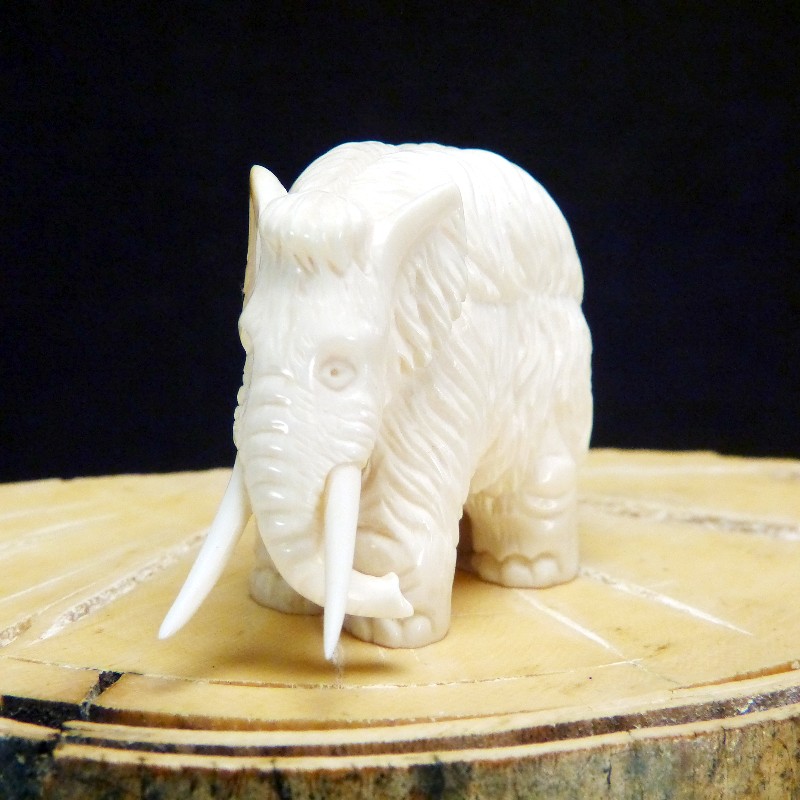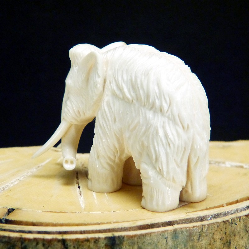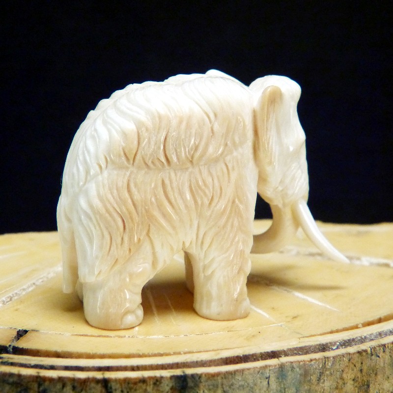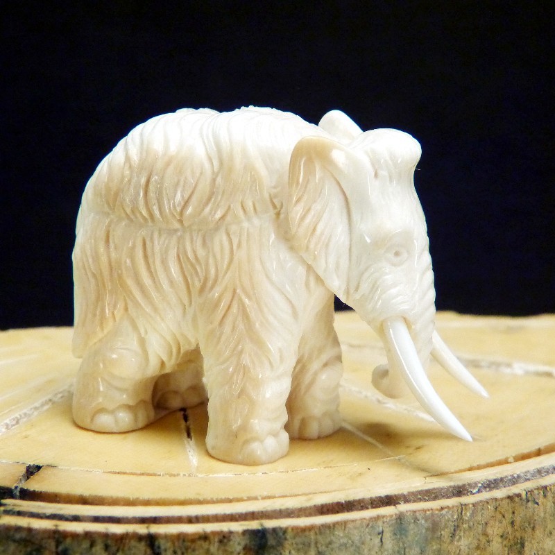 Von Hand geschnitztes Mammut mit feinem Fell, gefertigt aus einem massivem Stück Mammut-Elfenbein mit leichter Rindenfärbung.