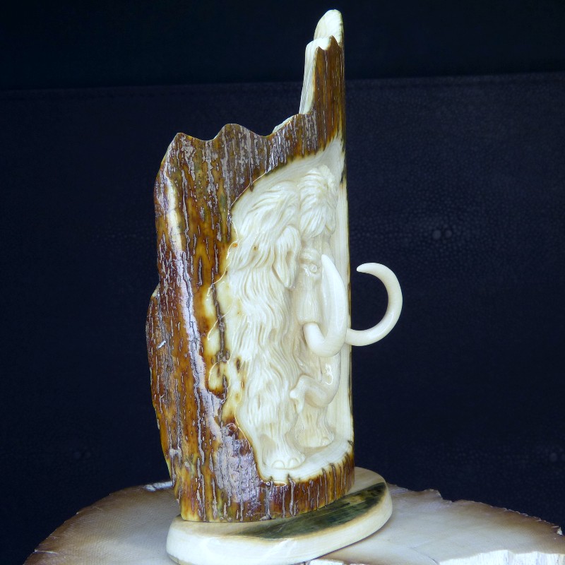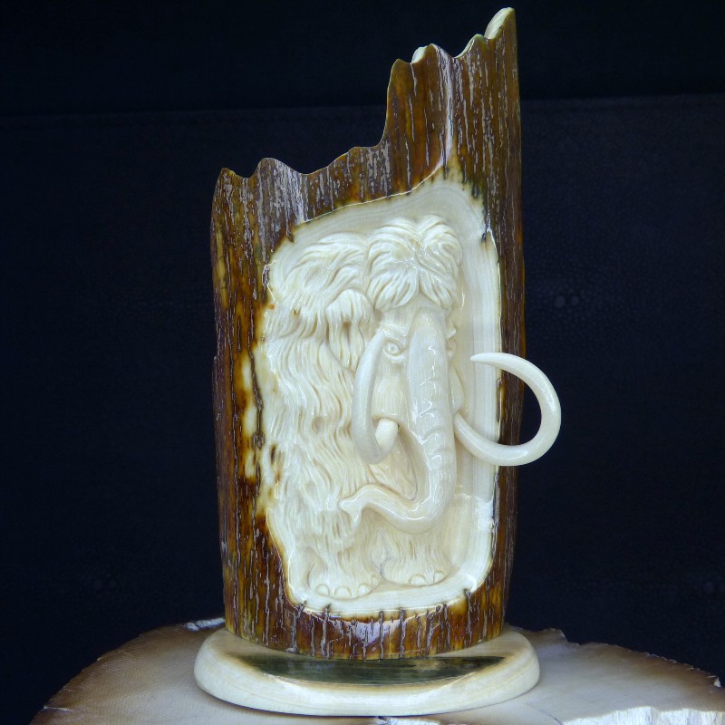 Mammut-Relief, detailliert aus dem äußeren Bereich eines Mammutzahns mit schöner Färbung und natürlicher Krümmung geschnitzt.