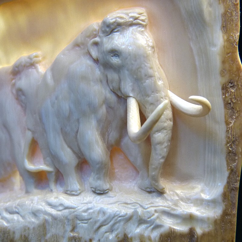 Mammut-Relief, detailliert und hauchdünn aus dem äußeren Bereich eines Mammutzahns mit natürlicher Rinde, direkt in die Krümmung geschnitzt. Durch die separate Fertigung der einzelnen Stoßzähne wirkt die Arbeit sehr plastisch und aus jedem Blickwinkel anders.