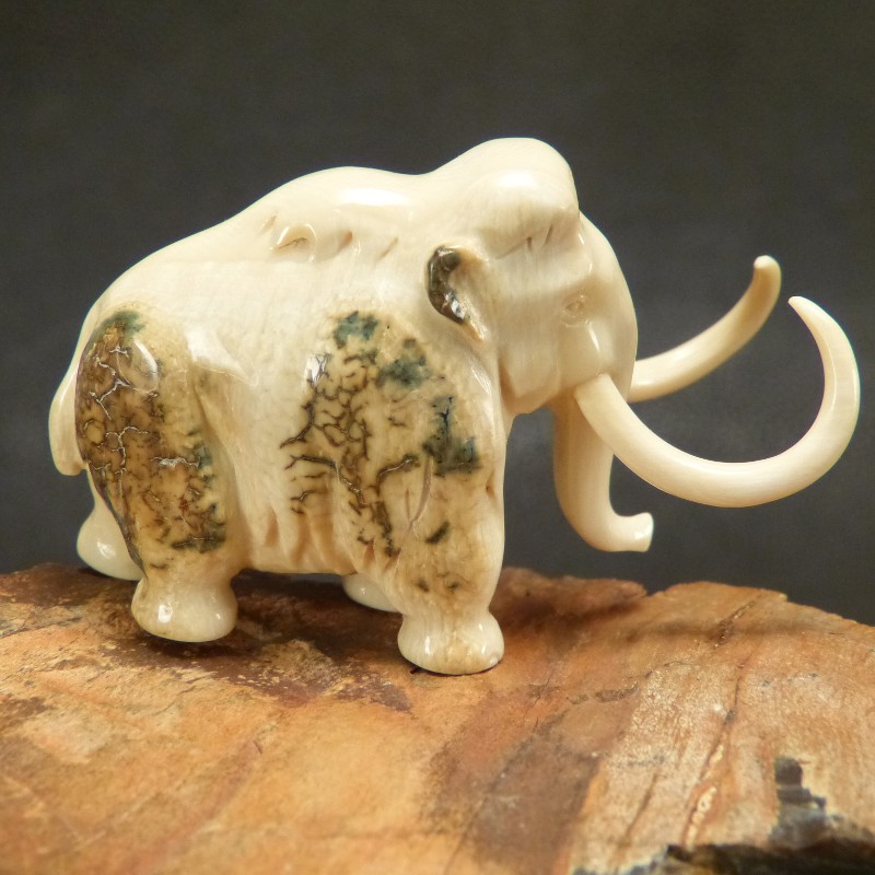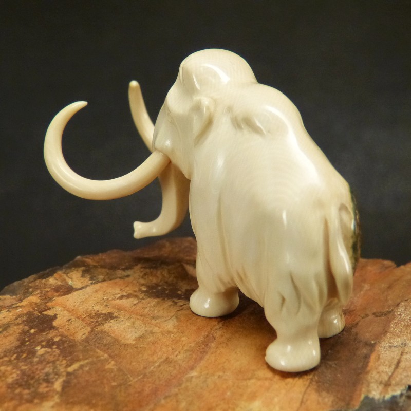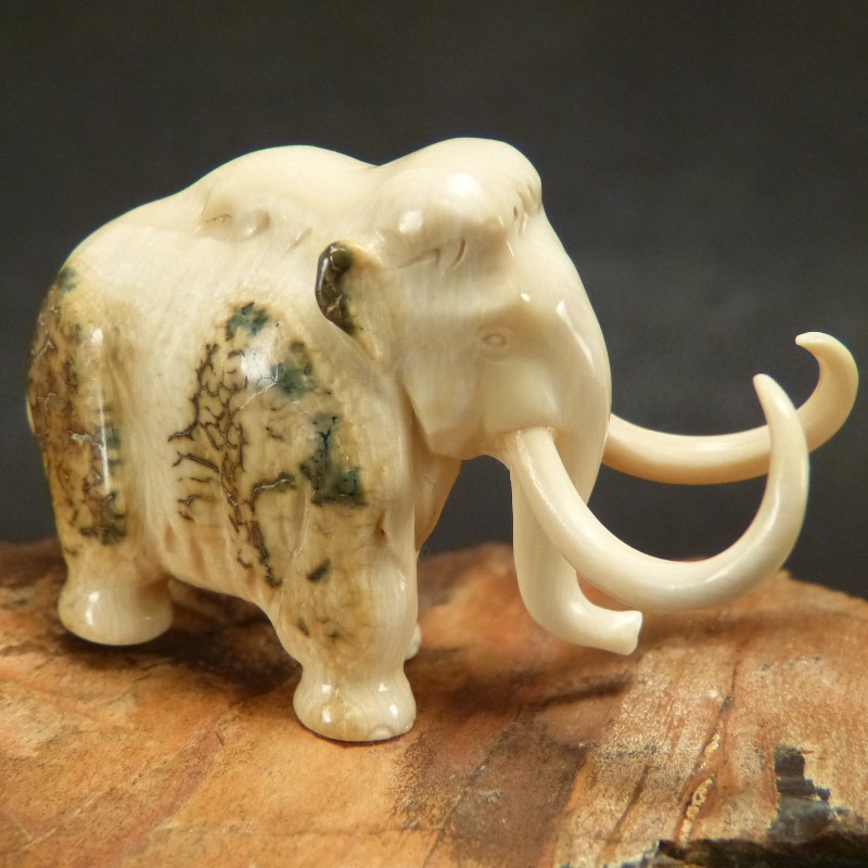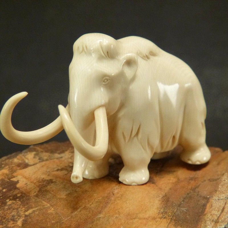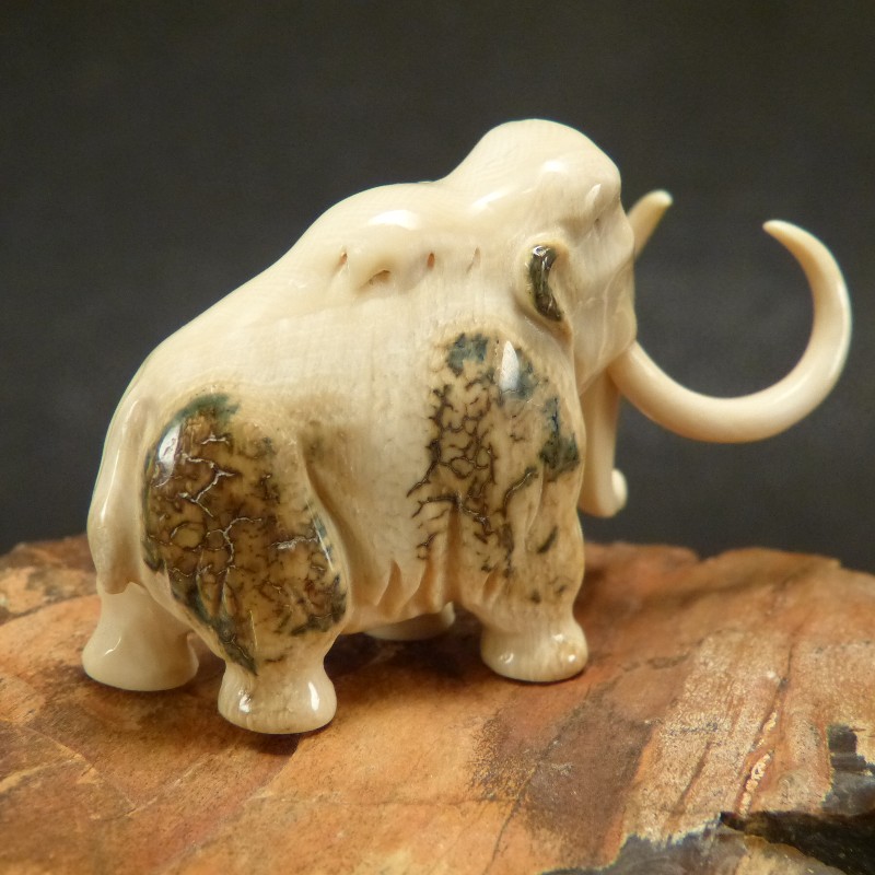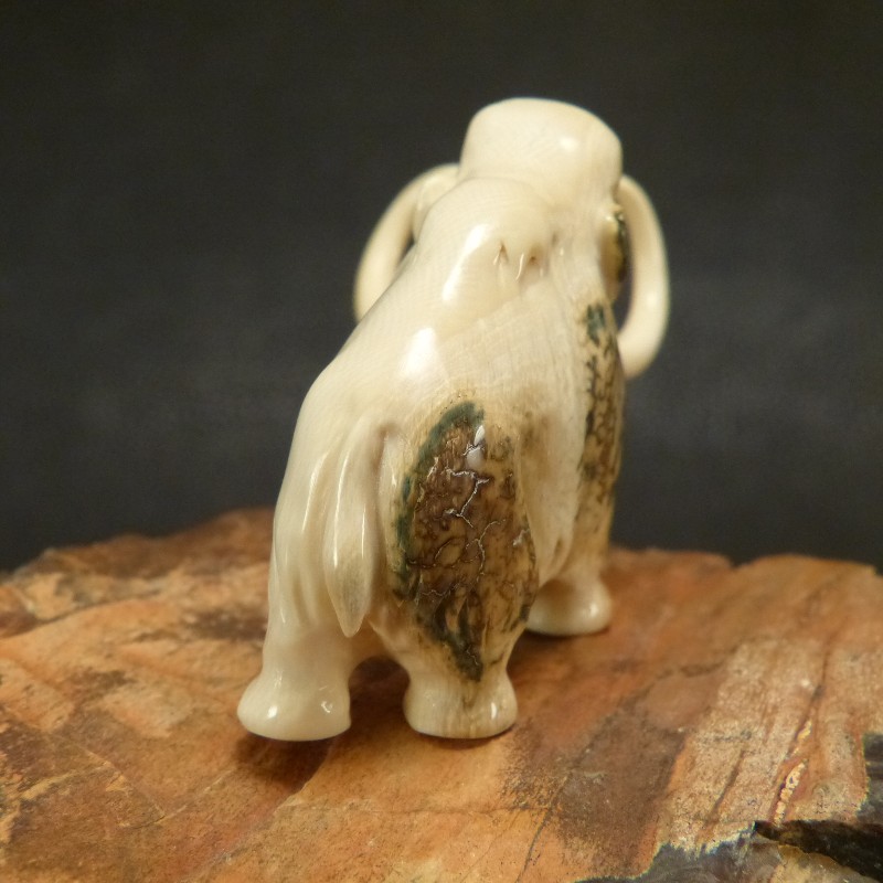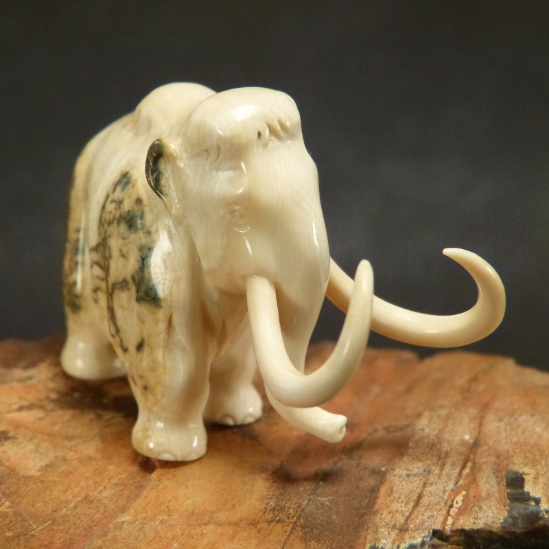 Schön geschnitzte Ausführung eines Wollhaarmammuts mit schöner Maserung und ausladenden Stoßzähnen, gefertigt aus cremefarbenem Mammutelfenbein mit toller Rindenfärbung.
