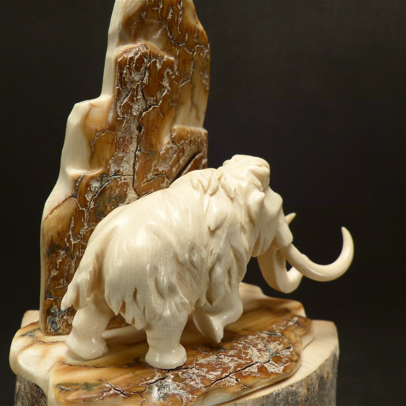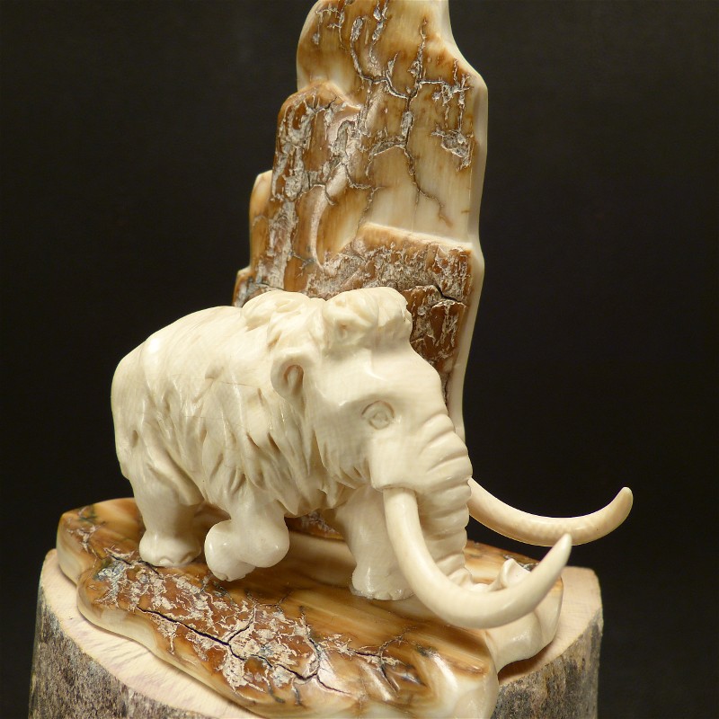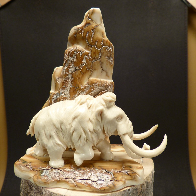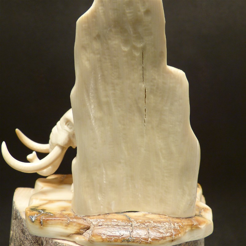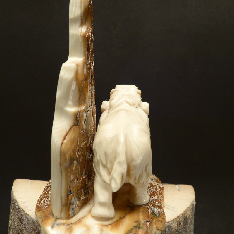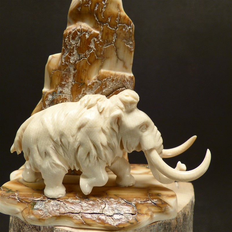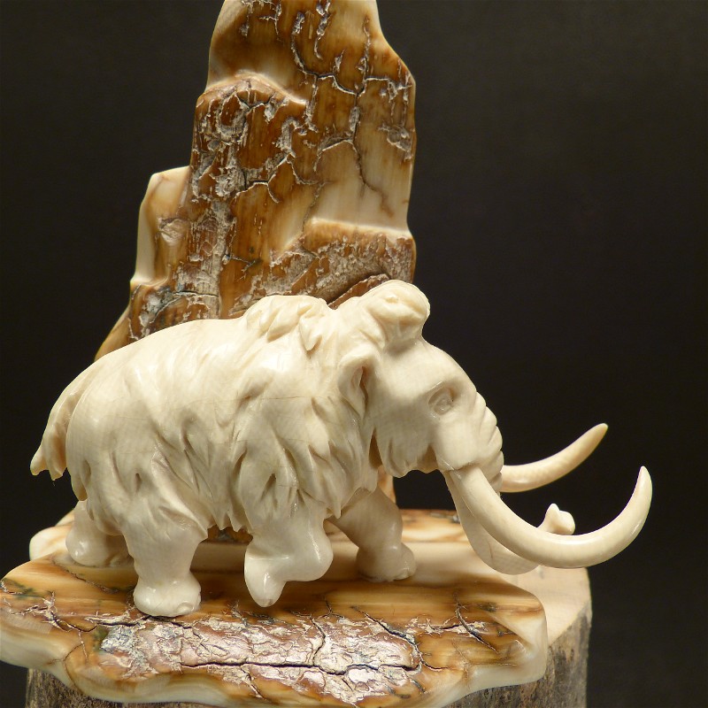 Sehr schön geschnitztes Mammut aus fossilem Mammut-Elfenbein mit ausgeprägter Maserung. Es ist auf einer Platte von der Außenrinde montiert und steht vor einem "Felsen", ebenfalls aus Mammut-Rinde. Die weit ausladenden, schön gebogenen Stoßzähne wurden separat angefertigt und sind eingesetzt. Gesamthöhe ca. 10cm, Länge ca. 8,5cm, Breite ca. 5,4cm