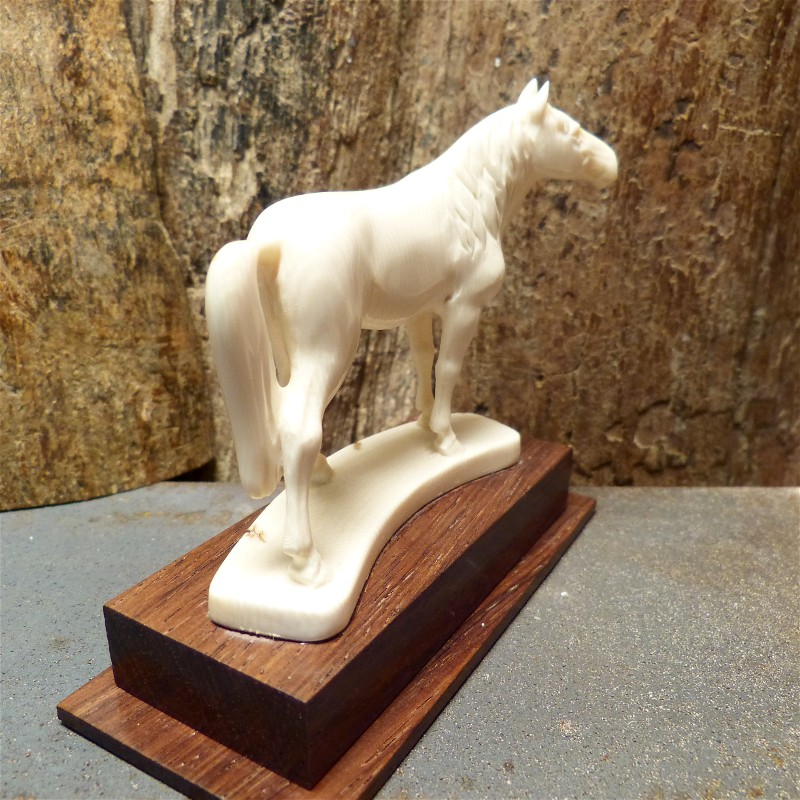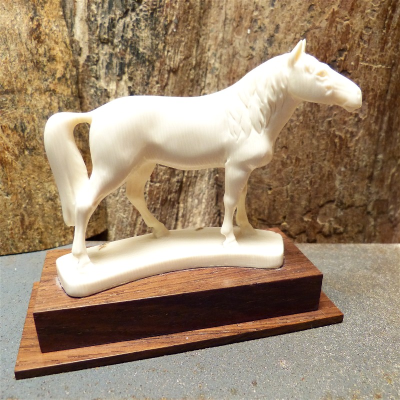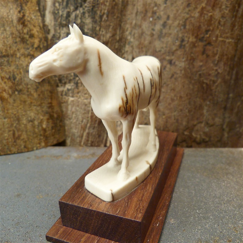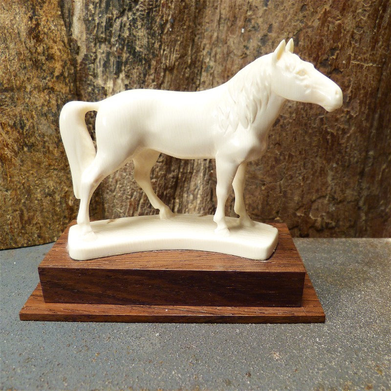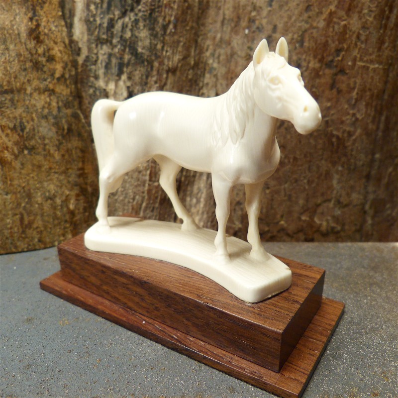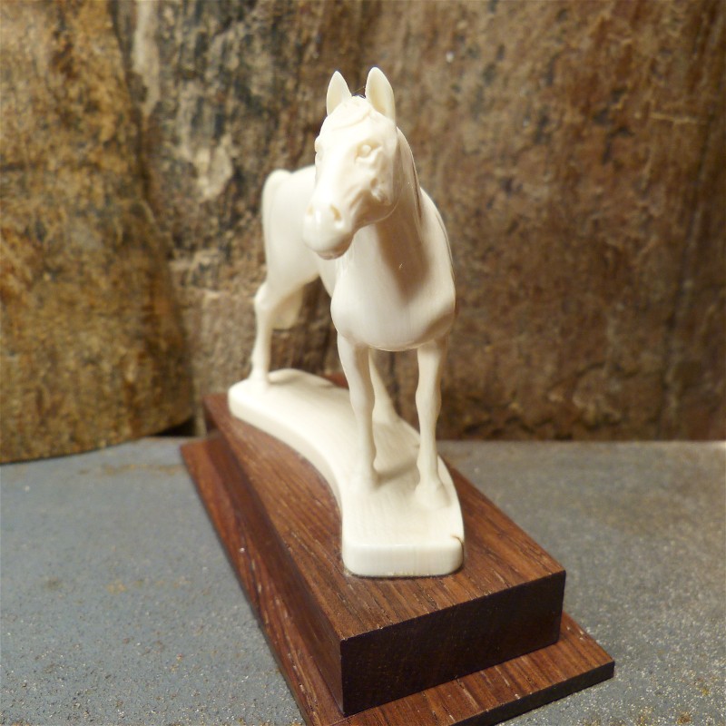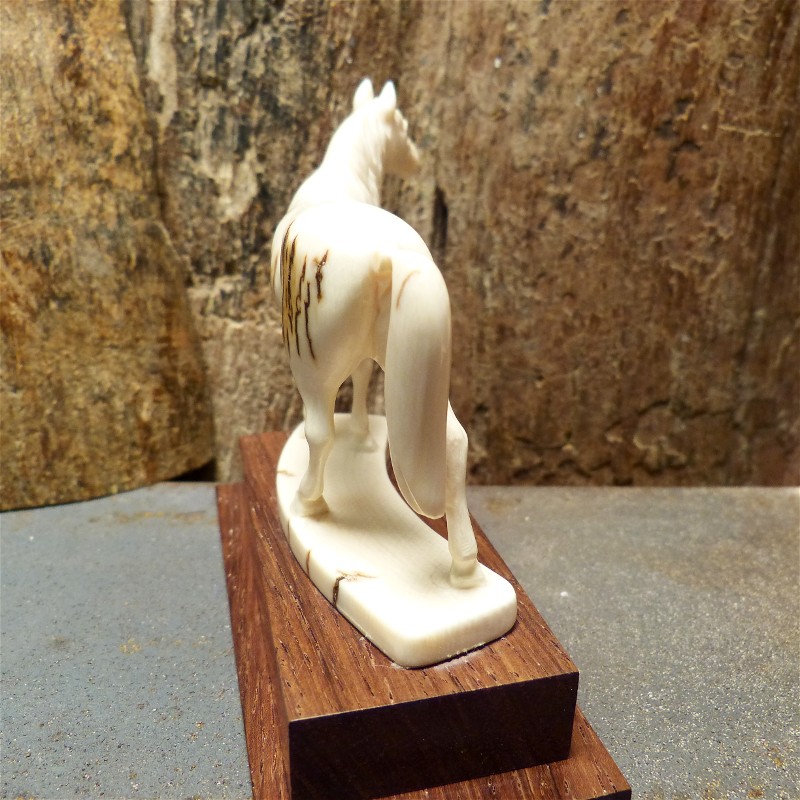Stehendes Pferd, detailliert geschnitzt aus hellem Mammut-Elfenbein mit schöner Maserung und toller Rindenstruktur. Die Figur wurde inklusive der Blende komplett aus einem Stück gefertigt. Diese