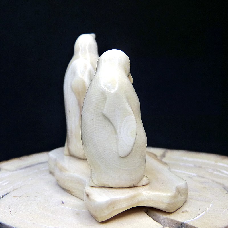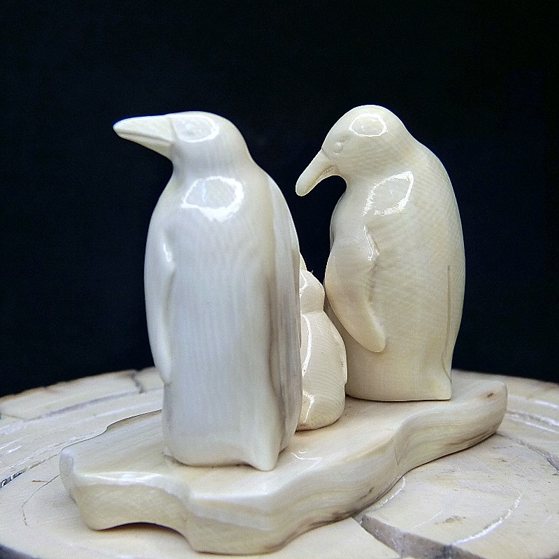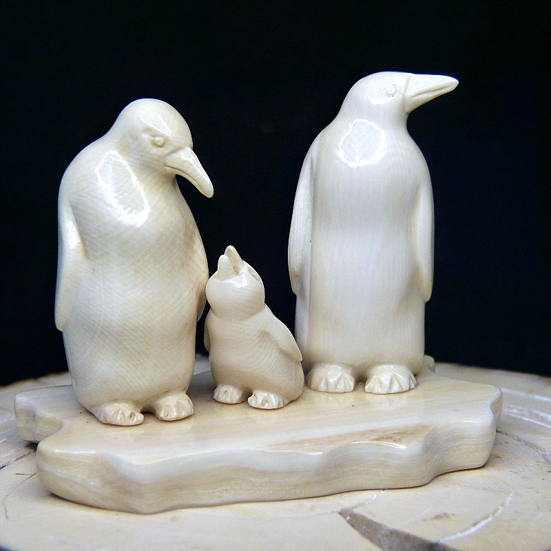 Sehr schöne und naturalistisch dargestellte Schnitzerei einer Pinguin-Familie. Einzeln aus massivem und leicht cremigem Mammut-Elfenbein gefertigt sind die Figuren auf einer "Eisscholle", ebenfalls aus Mammut-Elfenbein, montiert. Höhe ca. 57mm, Breite ca. 75mm, Tiefe ca. 46mm.