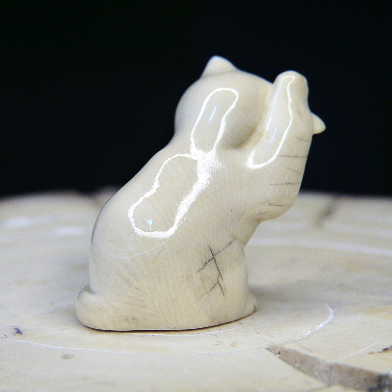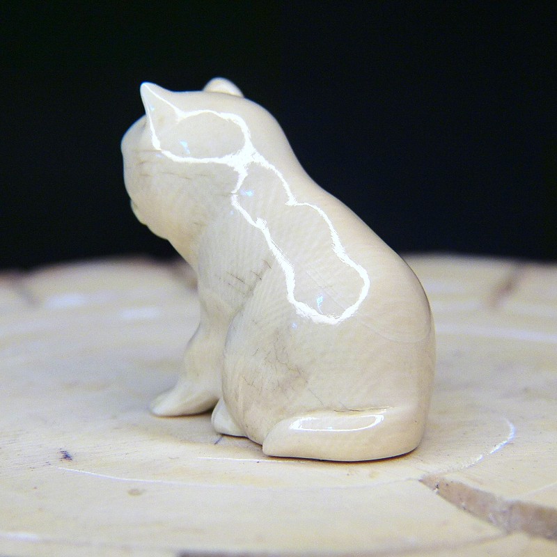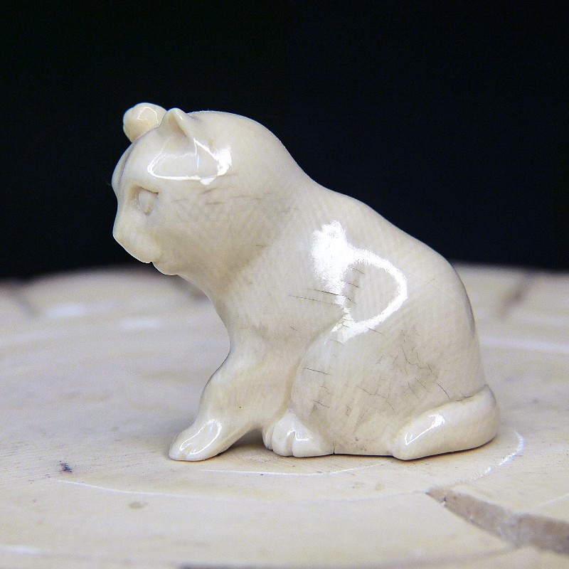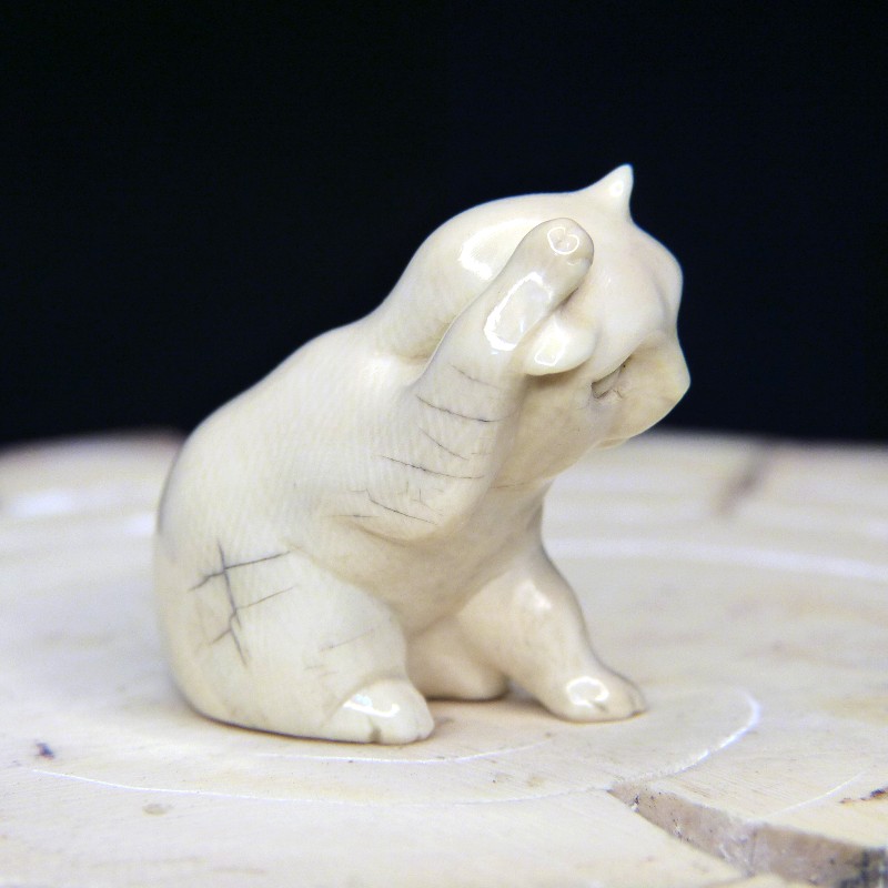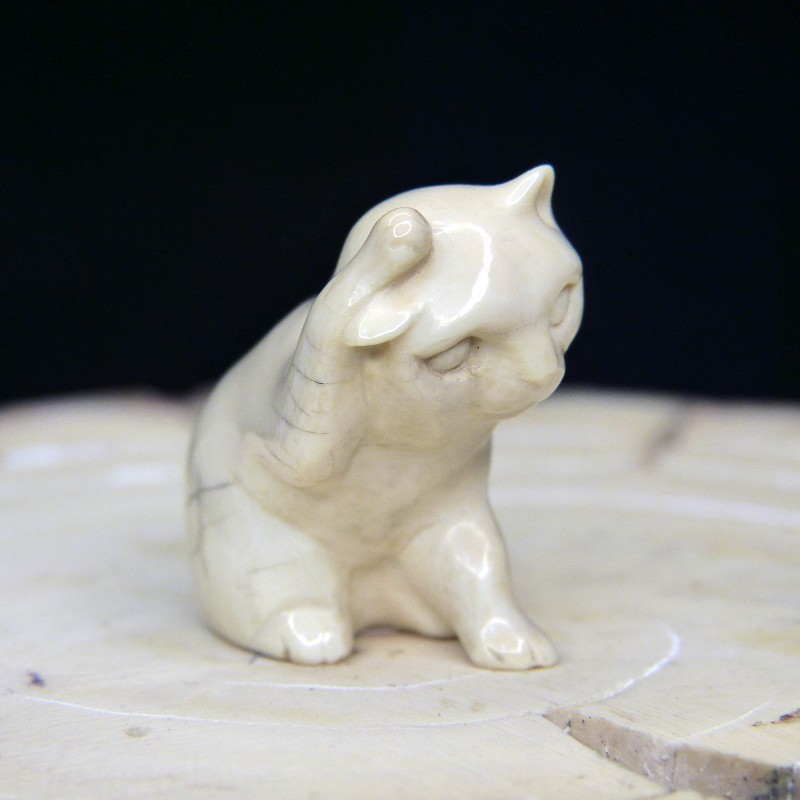 Kleine sich putzende Katze aus cremigem Mammutelfenbein mit natürlicher Verewitterung.