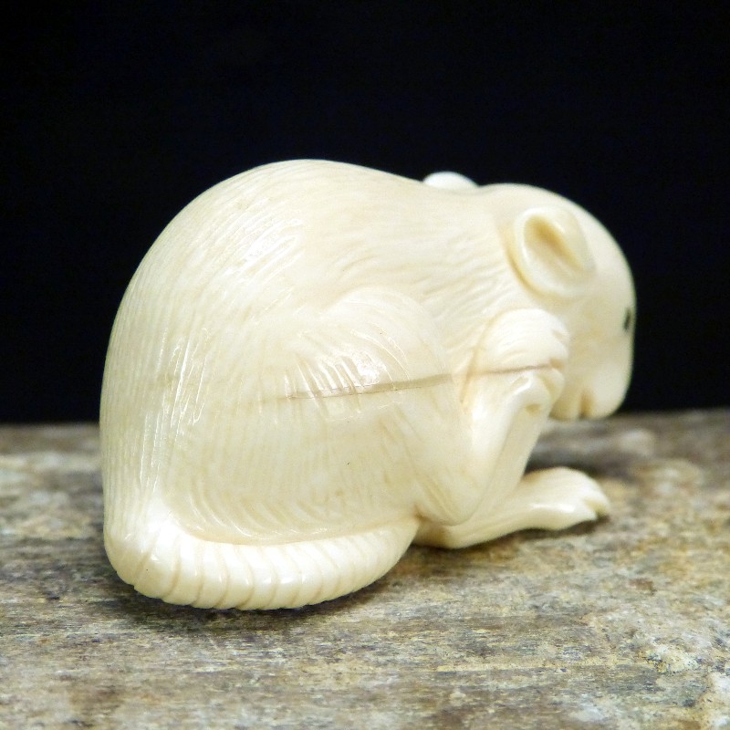 Ratte, geschnitzt aus hellem Mammut-Elfenbein mit feiner Maserung. Sie hat eine Höhe von ca. 28mm und ist ca. 48mm lang.