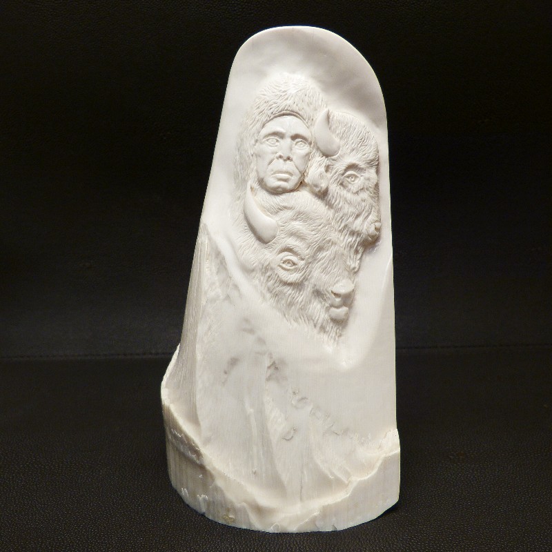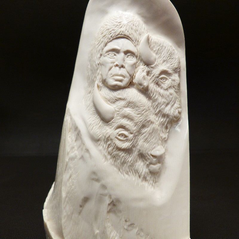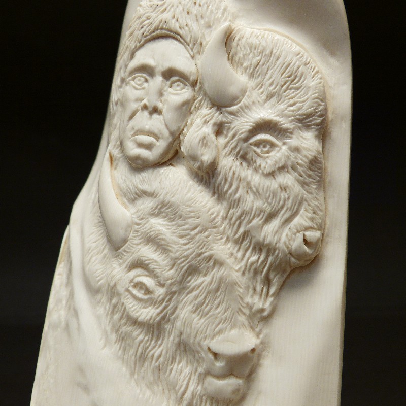 Reliefarbeit aus einem hellem, schweren Abschnitt eines Mammutzahns mit natürlichen Bruchkanten. Das fein und tief ausgearbeitete Motiv wirkt durch das Schattenspiel auf dem hellen Material sehr naturalistisch. Die Gesamthöhe misst ca. 17cm bei einer Breite von ca. 10,5cm.