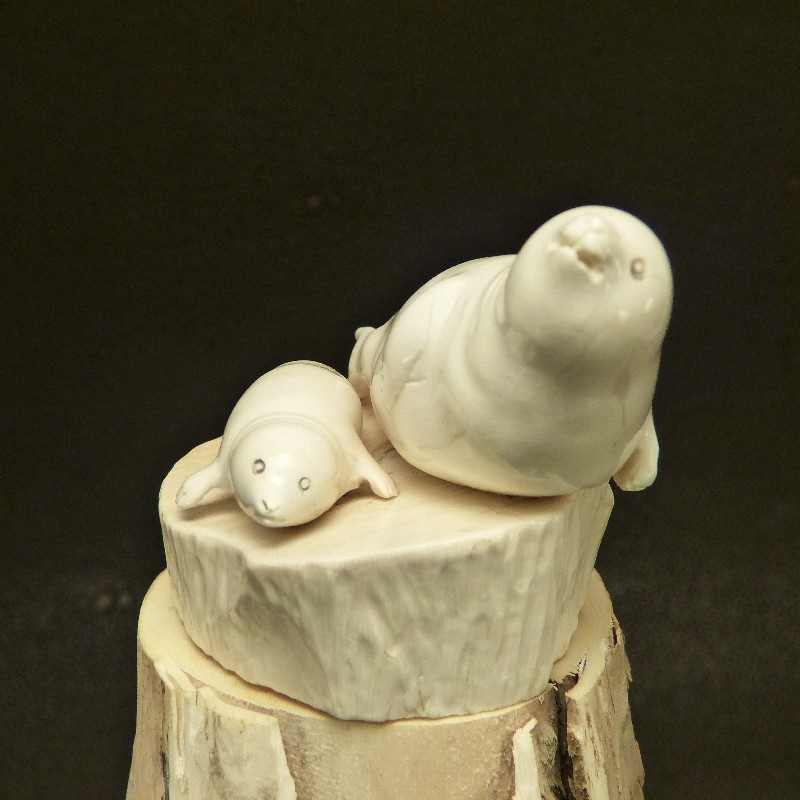 Aus hellem Mammut-Elfenbein gefertigte Robbe mit Baby, montiert auf einer "Eisscholle", ebenfalls aus fossilem Mammut-Elfenbein.