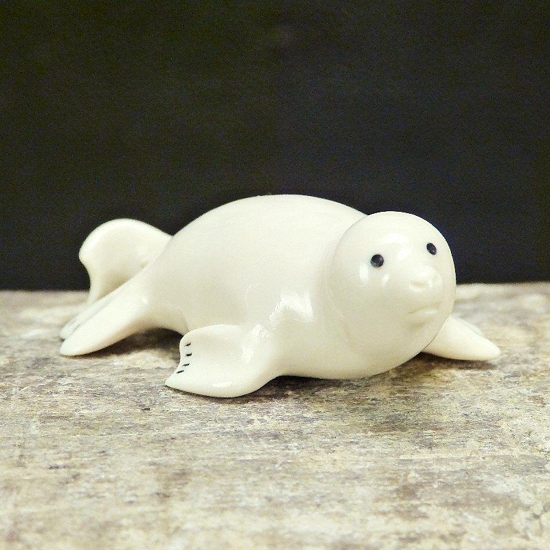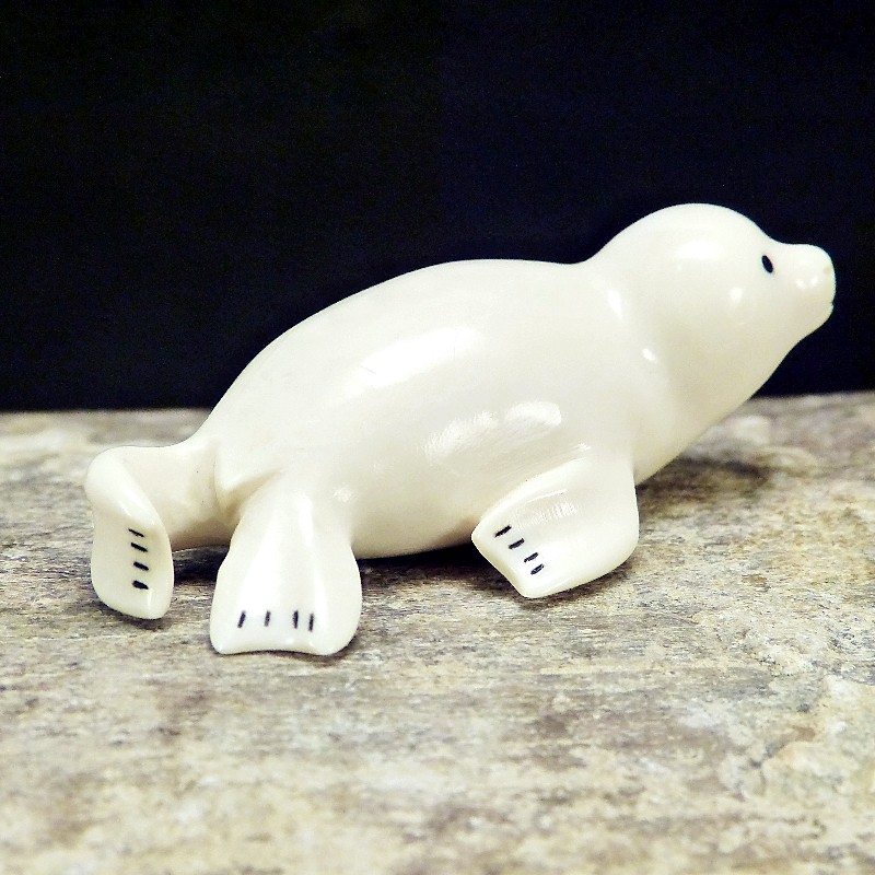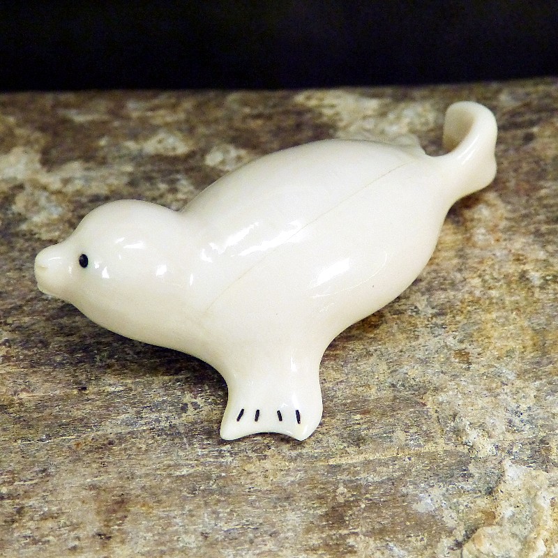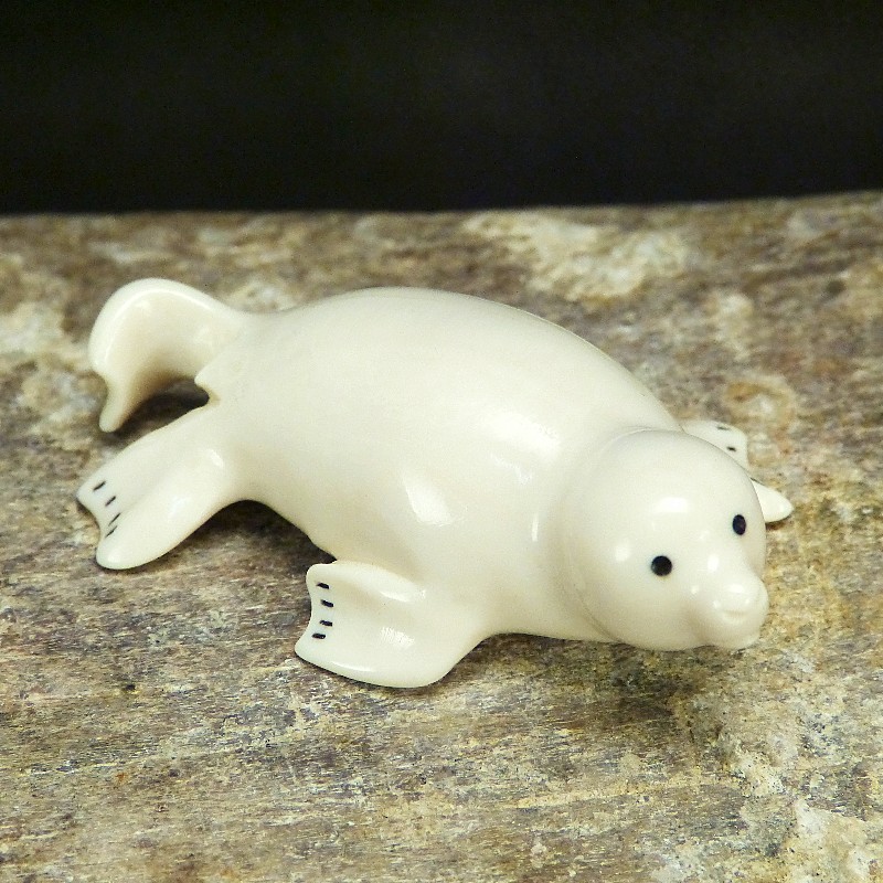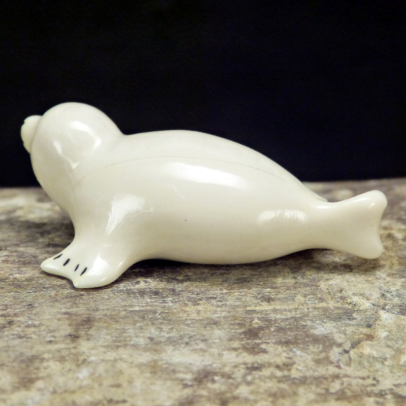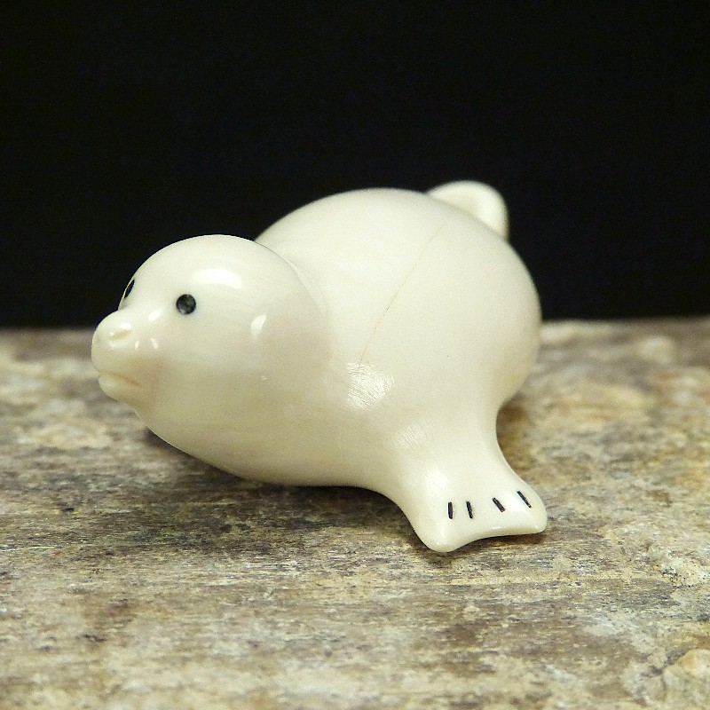 Kleine geschnitzte Robbe aus hellem Mammut-Elfenbein mit feiner Maserung und leichten Wasserflecken.