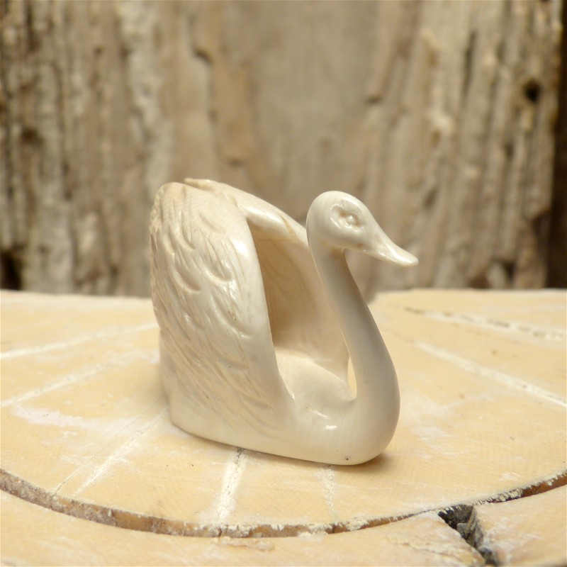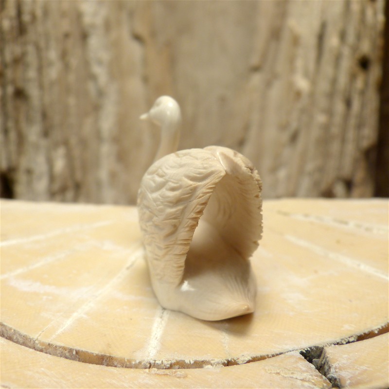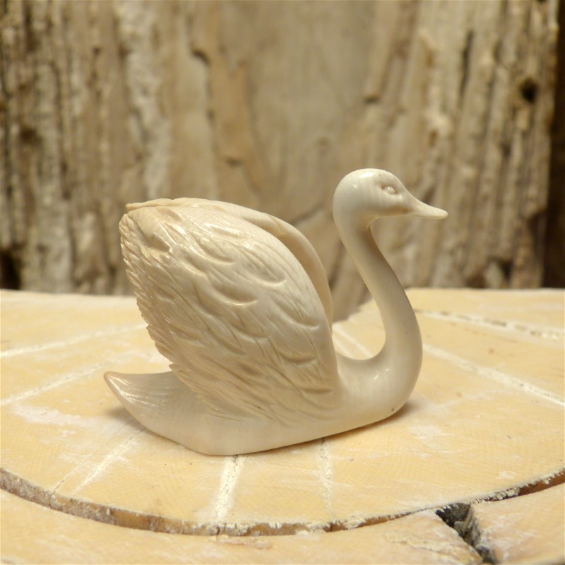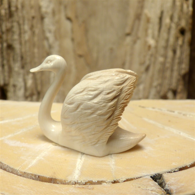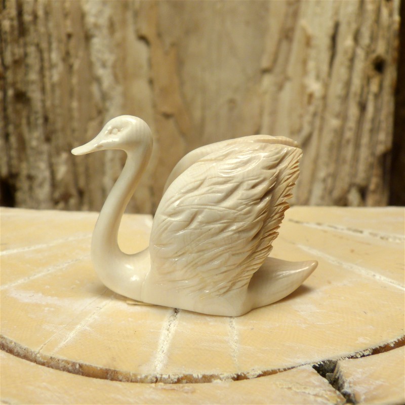 Detailliert geschnitzter Schwan aus cremefarbenem Mammut-Elfenbein mit feiner Maserung. Er hat eine Größe von ca. 42 x 20 x 32 mm. (LBH)