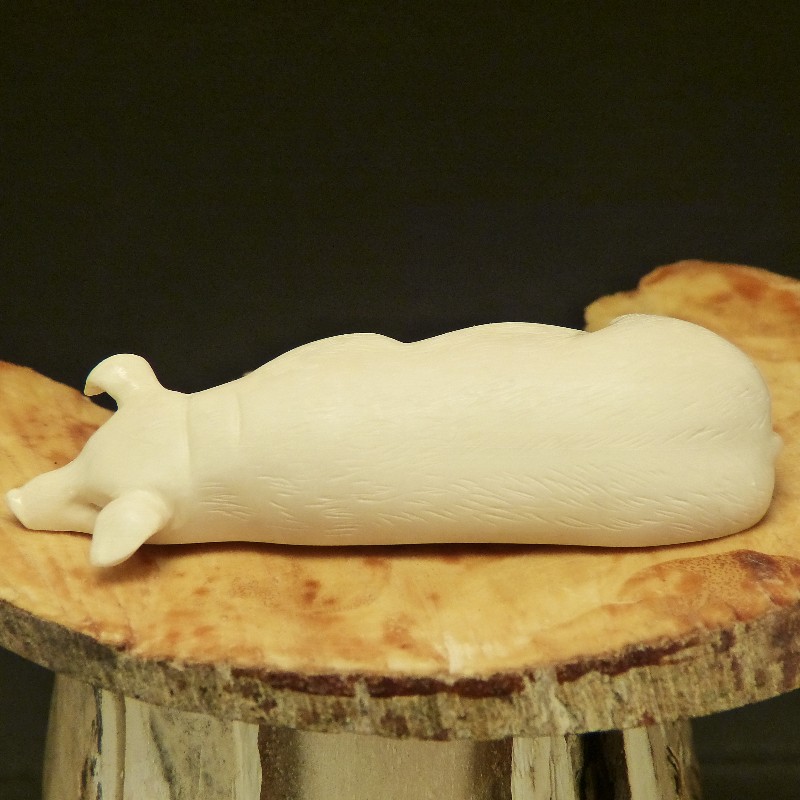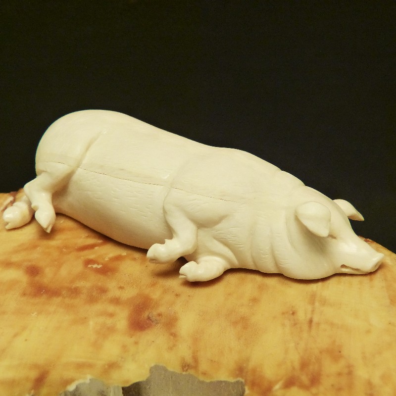 Aus fossilem Mammut-Elfenbein geschnitztes, liegendes Schwein mit naturgetreuer und detaillierter Ausarbeitung.