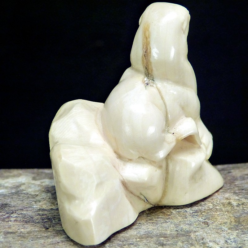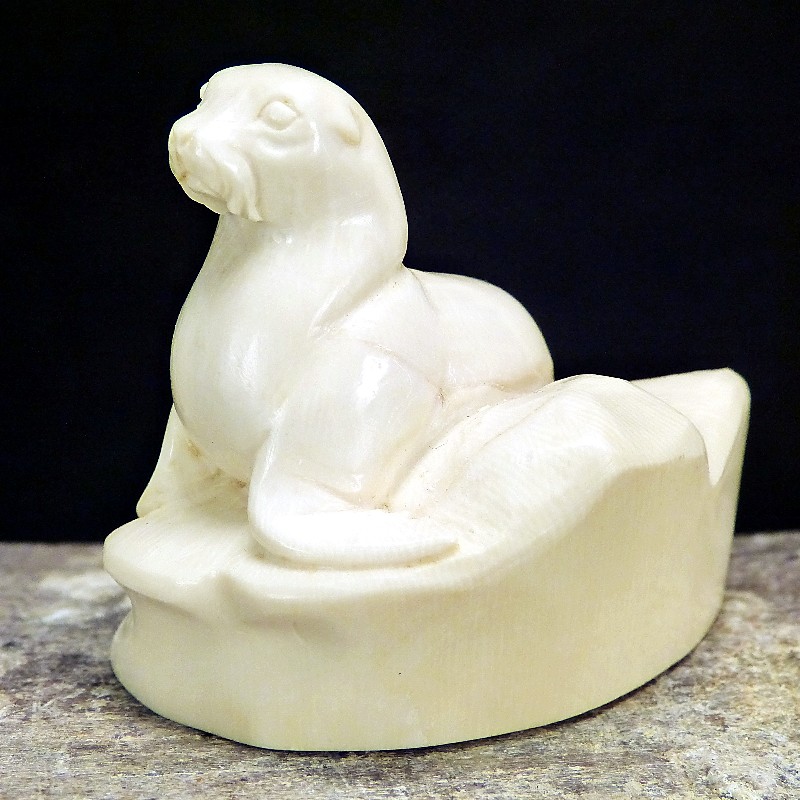 Auf einem Felsen sitzender Seehund, gefertigt aus einem Kernstück eines cremigen Mammutzahns. Sehr gut ist am Rücken der typische, längs durch den Zahn verlaufende Nerv zu erkennen.