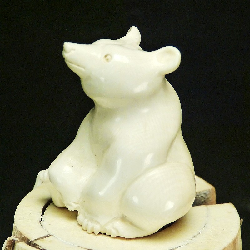 Sitzender Bär aus hellem Mammut-Elfenbein mit schöner Maserung. Er hat eine Größe von ca. 48mm bei einer Breite und Tiefe von ca. 32 x 35mm.