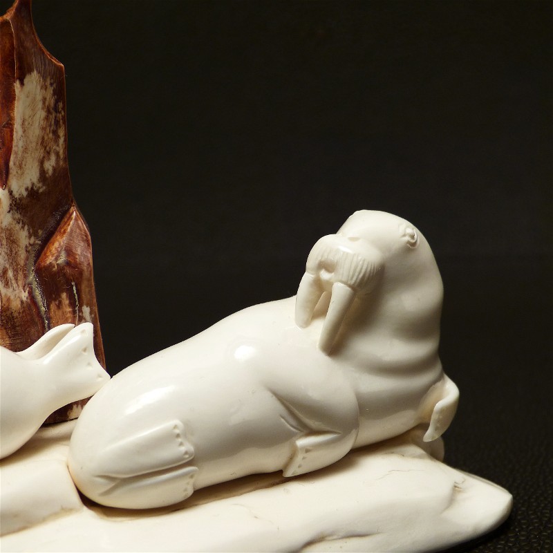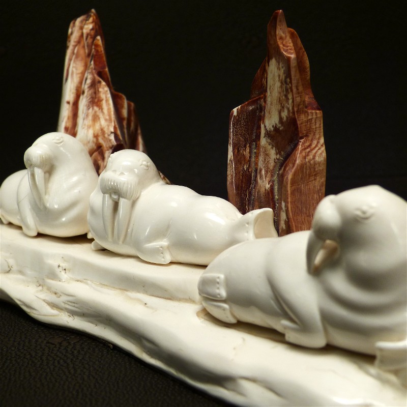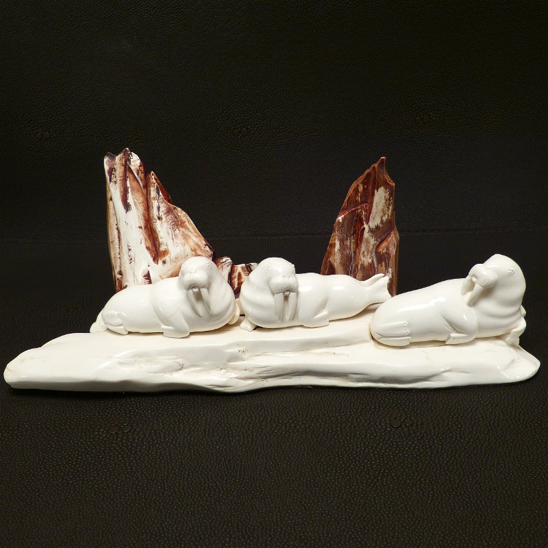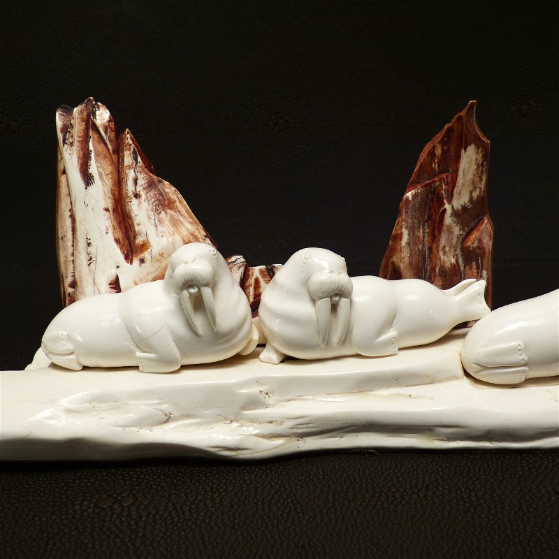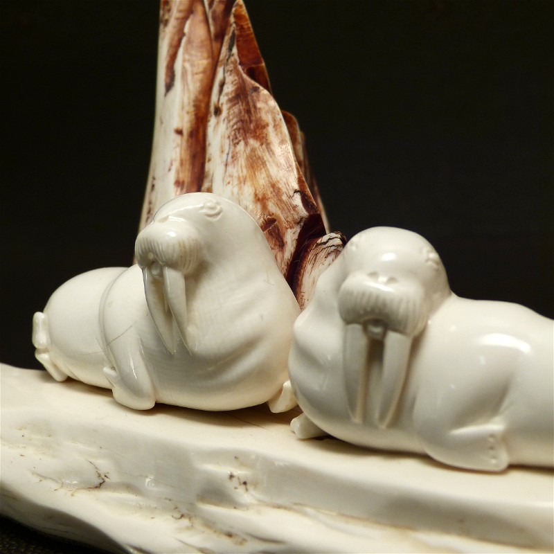 Naturalistisch dargestellte Walrossfamilie, einzeln aus hellem Mammut-Elfenbein gefertigt und auf einer "Eisscholle", ebenfalls aus hellem Mammut-Elfenbein, montiert. Die Schnitzerei hat eine Länge von ca. 21,5cm und eine Höhe von ca. 8,5 cm bei einer Tiefe von ca. 6,5 cm.