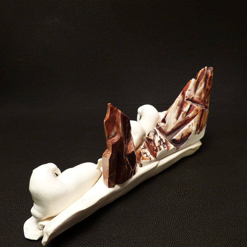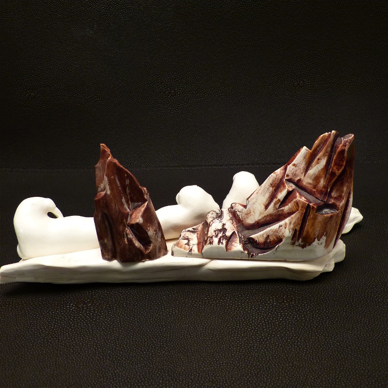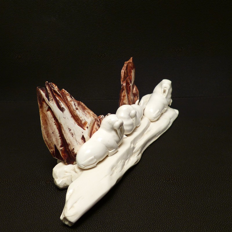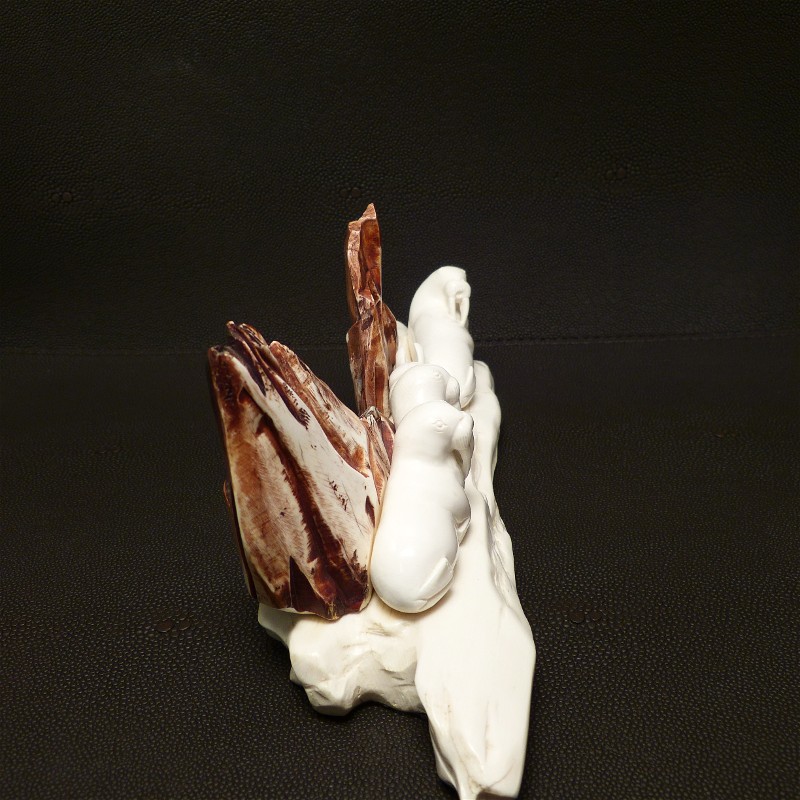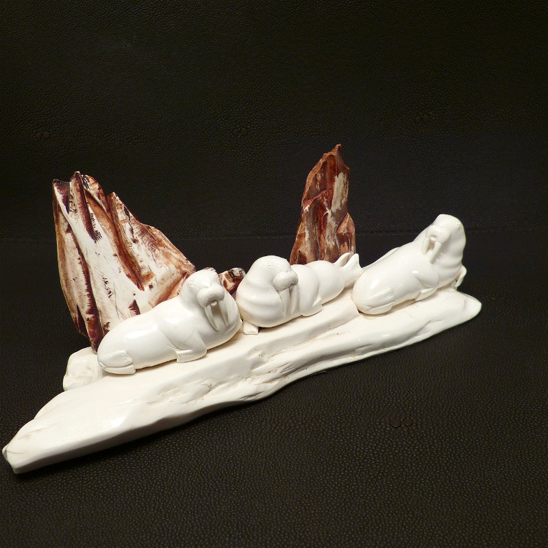 Naturalistisch dargestellte Walrossfamilie, einzeln aus hellem Mammut-Elfenbein gefertigt und auf einer "Eisscholle", ebenfalls aus hellem Mammut-Elfenbein, montiert. Die Schnitzerei hat eine Länge von ca. 21,5cm und eine Höhe von ca. 8,5 cm bei einer Tiefe von ca. 6,5 cm.