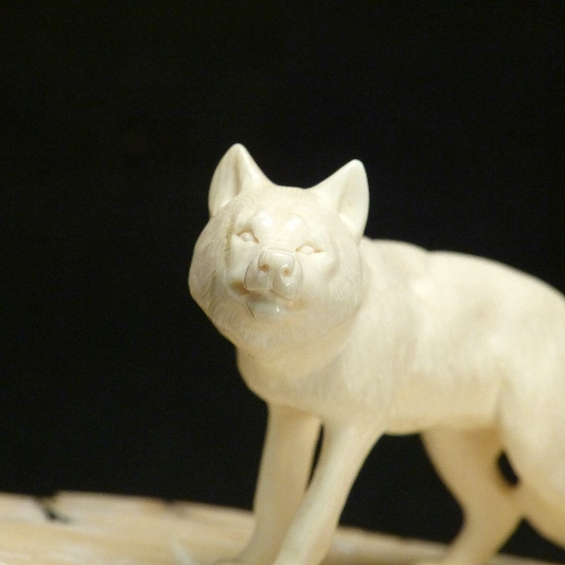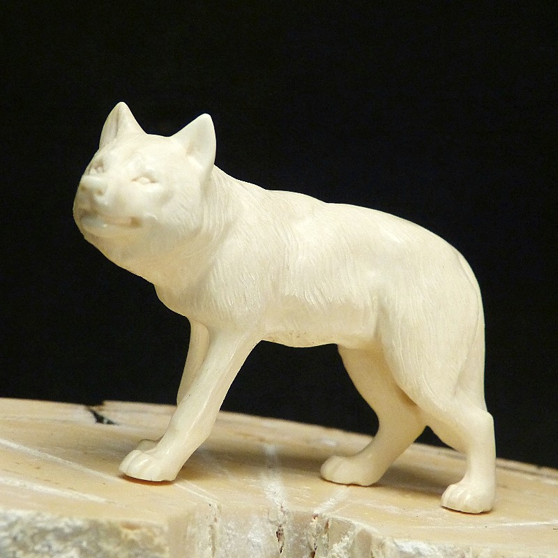 Fein und detailliert geschnitzte Darstellung eines Wolfes aus leicht cremigem Mammut-Elfenbein mit feiner Maserung und leichten Färbungen.