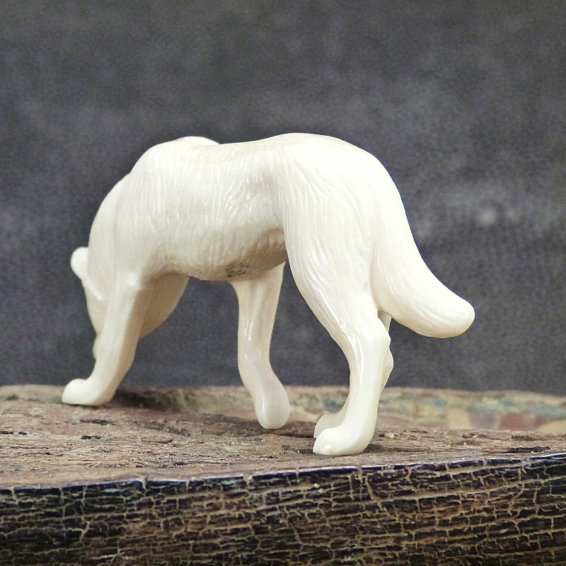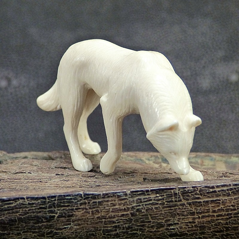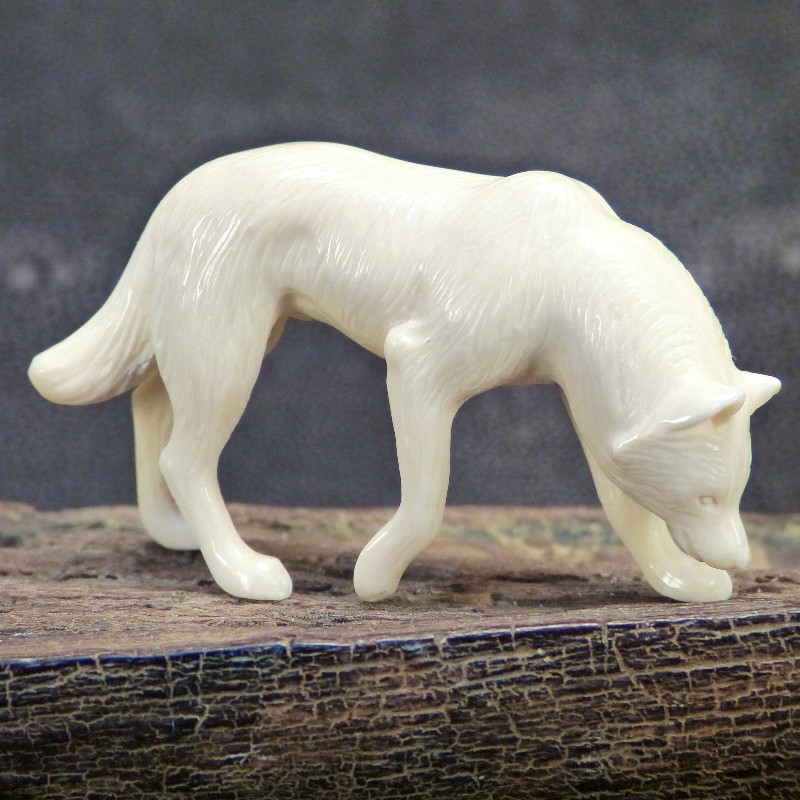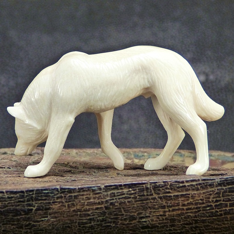 Von Hand geschnitzter Wolf aus einem hellem, rissfreiem Stück Mammut-Elfenbein mit feiner Maserung und dem für dieses Material typischen, breiten Zahnschmelz. Dieses Material stammt aus dem blanken Eis und wird nur zu etwa 10% gefunden. Es ist nicht durch Mineralien verfärbt und dadurch Elefantenelfenbein sehr ähnlich und zeigt praktisch die Originalfärbung von vor über 10.000 Jahren. Länge ca. 66mm, Höhe ca. 37mm, Breite ca. 18mm.