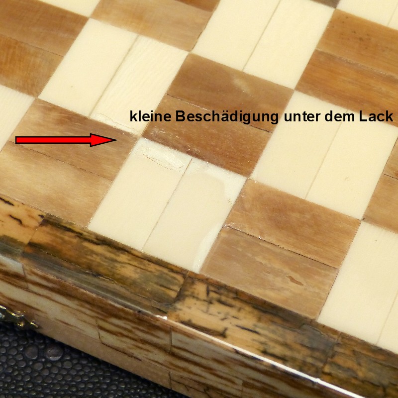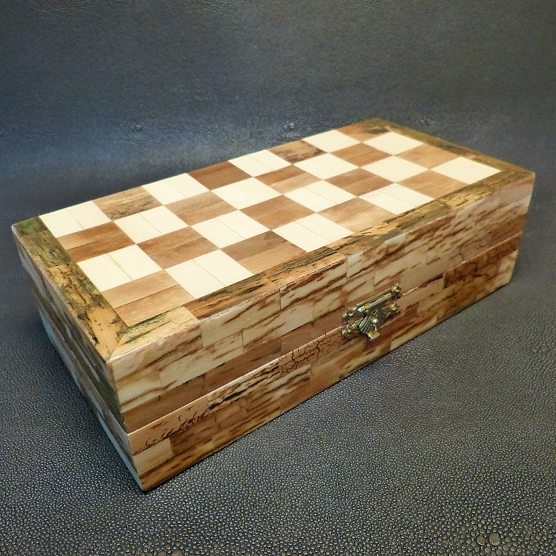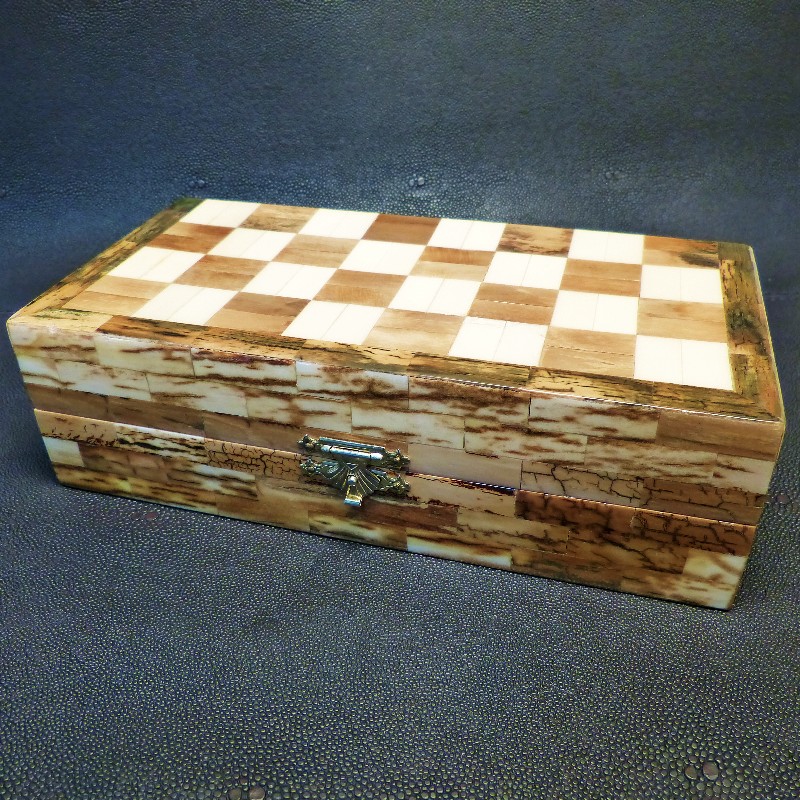 Die Schatulle dient sowohl als Brett als auch als Aufbewahrungskassette und wurde ebenfalls mit Mammut-Elfenbein belegt. Hierfür wurden auch Stücke der äußeren Rinde verwendet, die einen sehr abwechslungsreichen und lebhaften Rand zeigen.