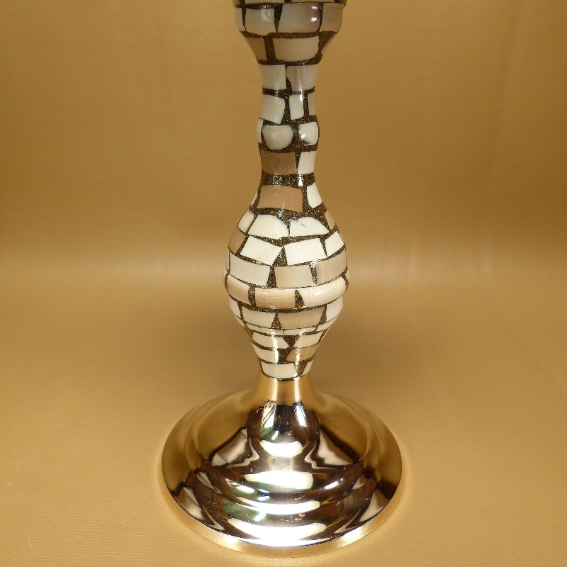 Exclusiver Kerzenleuchter aus poliertem Messing, belegt mit einem Mosaik unterschiedlicher Mammut-Plättchen. Die Gesamthöhe beträgt ca. 21cm, der Kerzenteller misst ca. 9cm im Durchmesser. Lieferung ohne Kerze. Einzelstück